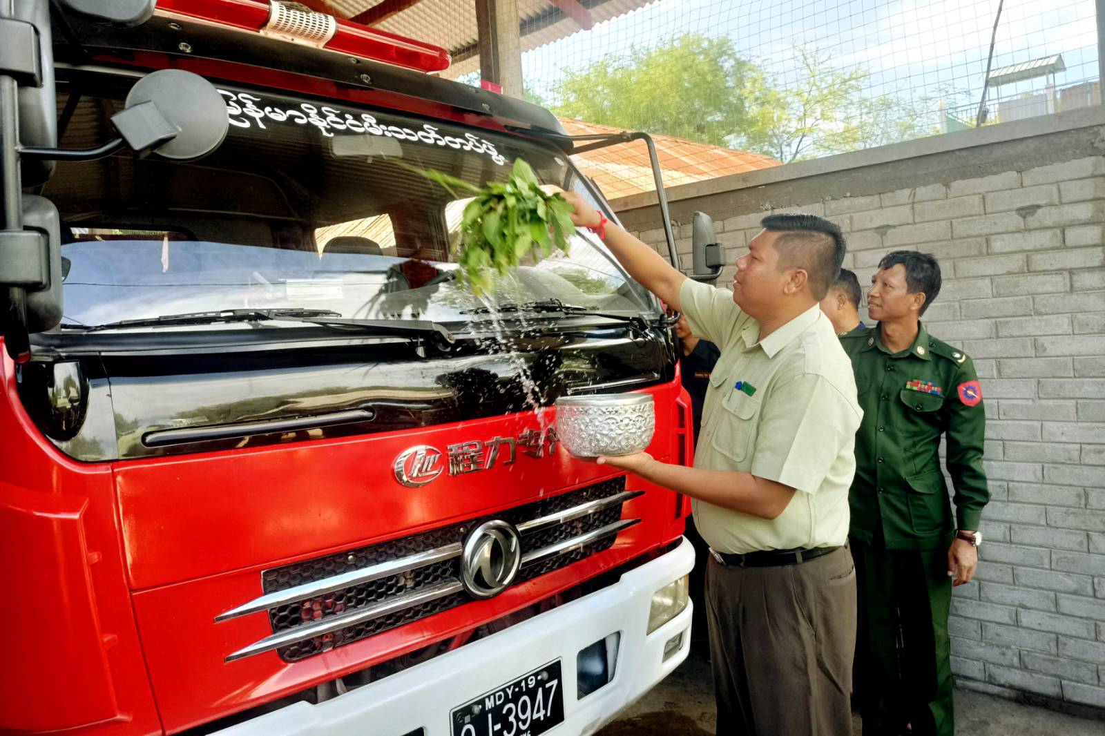 ထို့နောက် မြို့နယ်မီးဘေးလုံခြုံရေးအဖွဲ့၊ ဥက္ကဋ္ဌ မြို့နယ်အုပ်ချုပ်ရေးမှူး ဦးစိုးမင်းထက်၊ မြို့နယ်စီမံအုပ်ချုပ်ရေးအဖွဲ့ အဖွဲ့ဝင်များဖြစ်ကြသော ဗိုလ်မှူးဌေးသန်း၊ ဦးအောင်ကျော်သူတို့မှ မီးငြှိမ်းသတ်ယာဉ်အသစ်အား နံသာရည်များပက်ဖျန်းပေးခဲ့သည်။