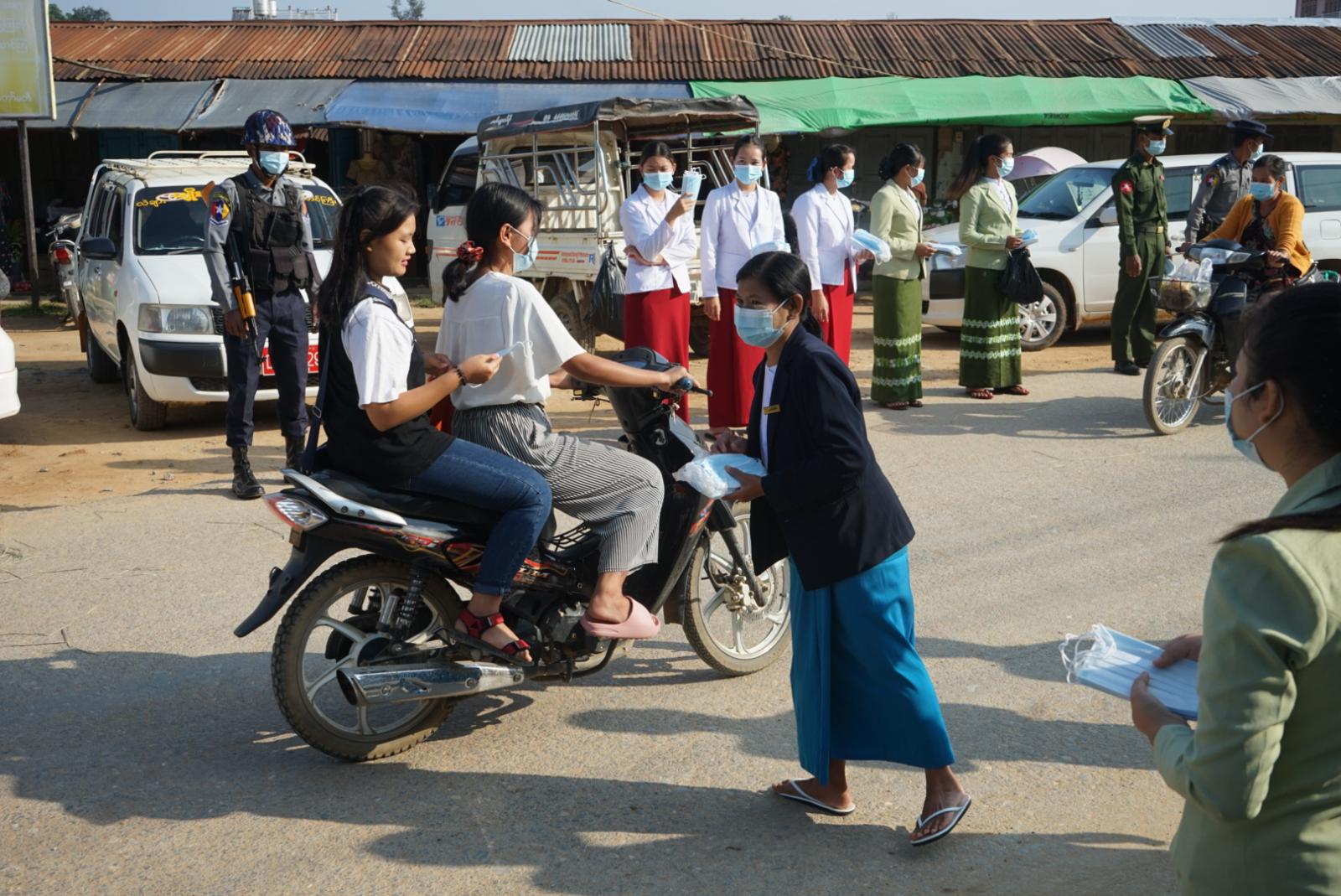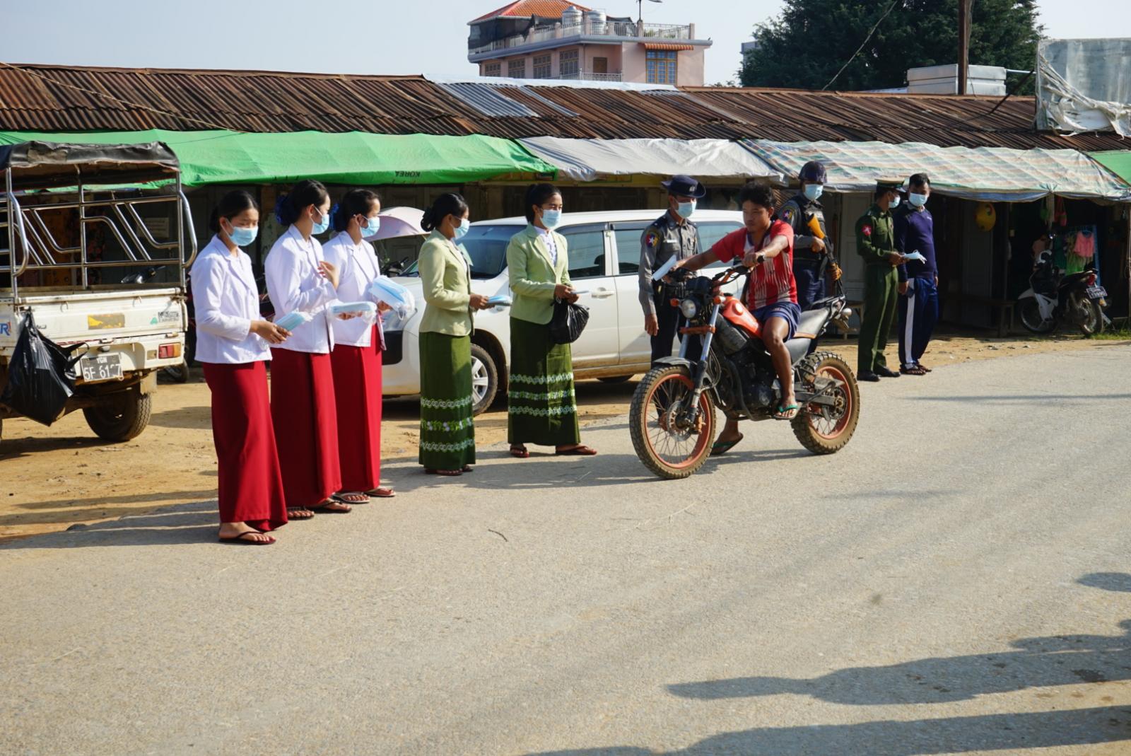 ထိုသို့ နှာခေါင်းစည်း(Mask)များ အခမဲ့ဖြန့်ဝေရာတွင် မြို့နယ်စီမံအုပ်ချုပ်ရေးအဖွဲ့ ဥက္ကဋ္ဌ ဦးဖြိုးမြင့်ဝေ၏ ဦးဆောင်မှုဖြင့် ကျန်းမာရေးဌာနမှ ဝန်ထမ်းများနှင့် ဌာနဆိုင်ရာဝန်ထမ်းများ ပူးပေါင်း၍ မြို့မစျေး၊ ပျံကျစျေး၊ ကားဂိတ်နှင့် လူစည်ကားရာနေရာများတွင် နှာခေါင်းစည်း (Mask)တပ်ဆင်ထားခြင်းမရှိပဲ သွားလာနေကြသည့် စျေးရောင်း၊ စျေးဝယ်ပြည်သူများ၊ ကျောင်းသား/သူများအား နေအိမ်ပြင်ပသို့ထွက်ခွာပါက နှာခေါင်းစည်း (Mask)များ မဖြစ်မနေ တပ်ဆင်သွားလာစေရန်နှင့်ကျန်းမာရေးဝန်ကြီးဌာနမှ ထုတ်ပြန်သော စည်းကမ်းချက်များကို လိုက်နာဆောင်ရွက်သွားကြရန် အသိပညာပေးပြောကြားခဲ့ပြီး နှာခေါင်းစည်း (Mask) (၂၀၀၀) ခုအား အခမဲ့ဖြန့်ဝေခဲ့ကြောင်း သိရသည်။