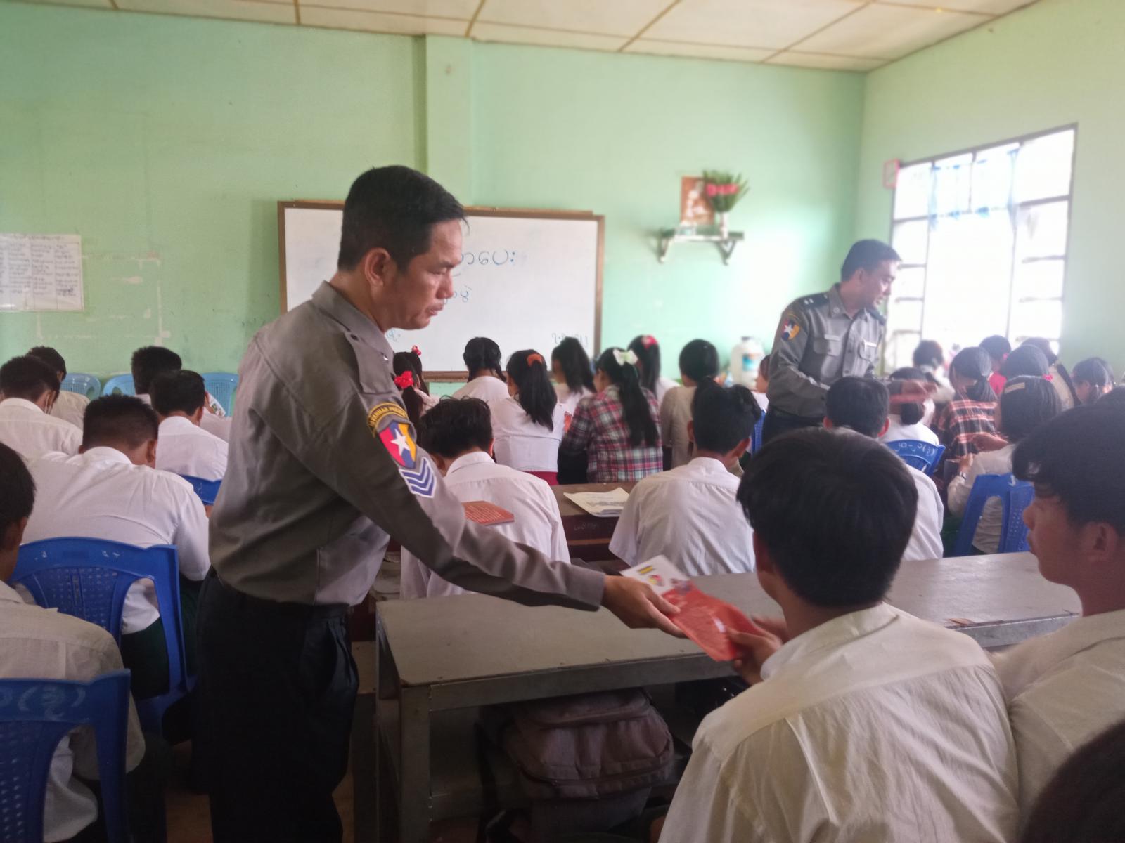 ထို့နောက် လူကုန်ကူးမှုတားဆီးကာကွယ်နှိမ်နှင်းရေးရဲတပ်ဖွဲ့မှ ဟောပြောပွဲသို့ တက်ရောက် လာကြသော ဆရာ၊ဆရာမများနှင့် ကျောင်းသား/ကျောင်းသူများအား လူကုန်ကူးမှု တားဆီး ကာကွယ်ရေး အသိပညာပေး လက်ကမ်းစာစောင်များ ဖြန့်ဝေပေးခဲ့သည်။ အဆိုပါဟောပြောပွဲသို့ အမှတ်(၂) အခြေခံပညာ အထက်တန်းကျောင်းမှ ဆရာဆရာမများနှင့် ကျောင်းသား၊ကျောင်းသူ (၉၀)ဦးခန့် တက်ရောက်ခဲ့ကြောင်း သိရသည်။