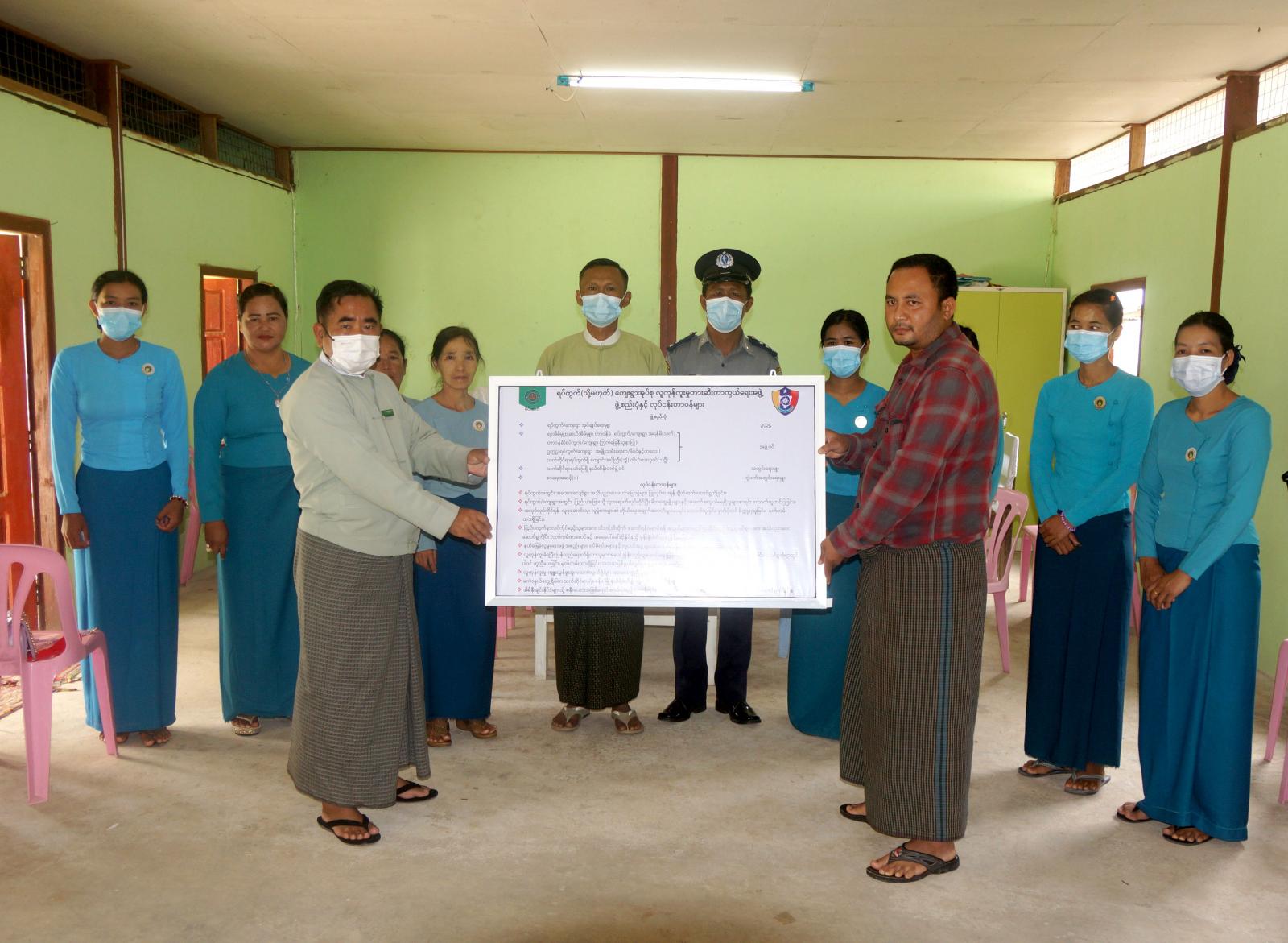လူကုန်ကူးမှုတားဆီးကာကွယ်ရေးအဖွဲ့၊ ဖွဲ့စည်းပုံနှင့် လုပ်ငန်းတာဝန်များပါရှိသည့် နံရံကပ်ဘုတ်အား ခရိုင်လူကုန်ကူးမှုတားဆီးကာကွယ်ရေးအဖွဲ့ ဥက္ကဋ္ဌ၊ ခရိုင်စီမံအုပ်ချုပ်ရေးအဖွဲ့ဥက္ကဋ္ဌ ဦးအောင်ဟိန်းကျော် က ဝိန်းနေရပ်ကွက် အုပ်ချုပ်ရေးမှူး ဦးစိုင်းထွန်းထံသို့လည်းကောင်း၊ မြို့နယ်စီမံအုပ်ချုပ်ရေးအဖွဲ့ဥက္ကဋ္ဌ ဦးအားလွန်က ဝိန်းဝိုင်ရပ်ကွက်အုပ်ချုပ်ရေးမှူး ဦးစည်သူကျော်ထံသို့လည်းကောင်း ပေးအပ်ခဲ့သည်။