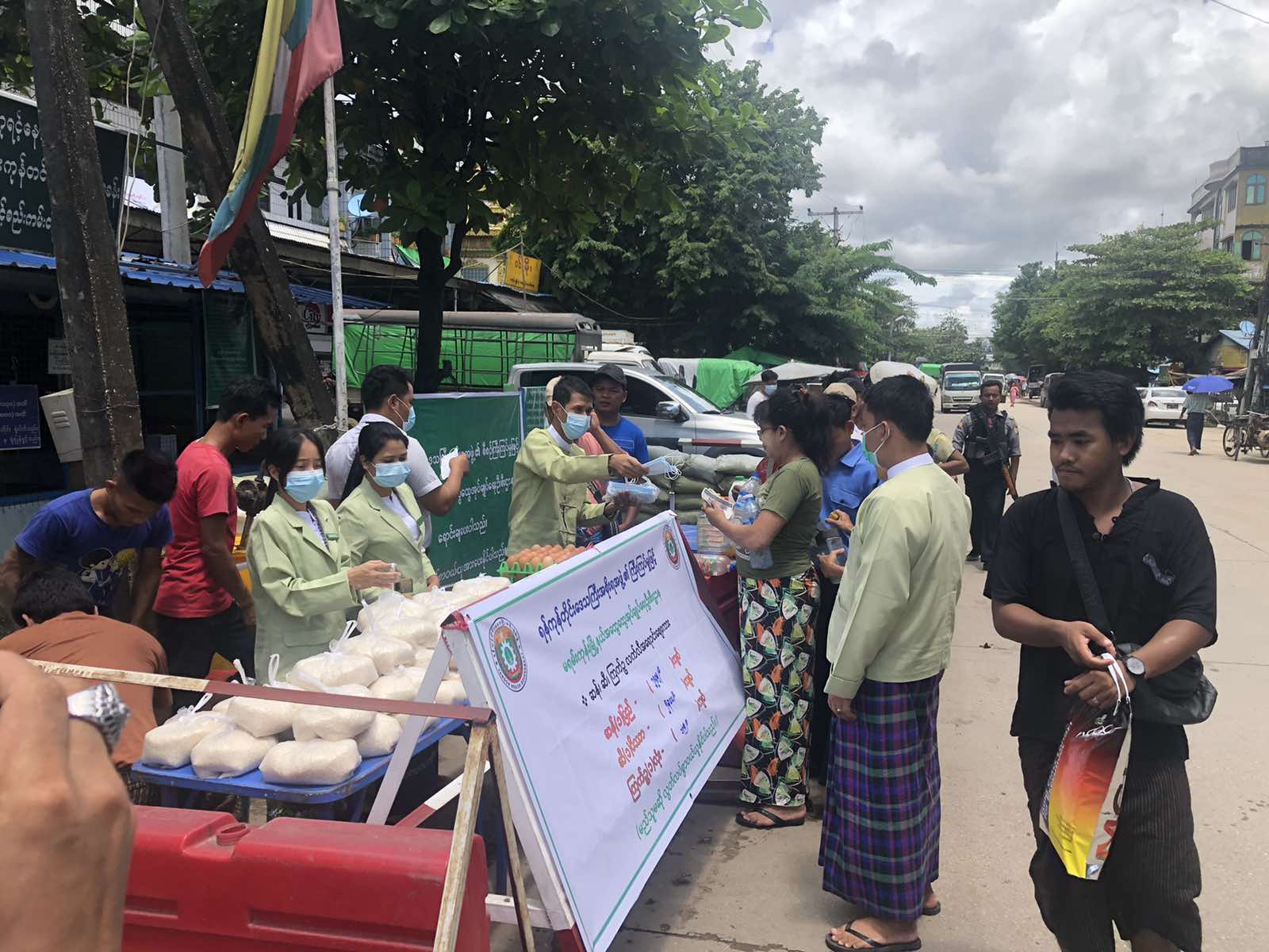 အဆိုပါရောင်းချသည့် အစားသောက်ကုန်များမှာ ဆန်၊ ဆီ၊ ကြက်ဥတို့ဖြစ်ပြီး ဆန်တစ်ပြည်လျှင် (၁၅၈၅/-) ကျပ်၊ ဆီ၁ပိဿာလျှင် (၅၃၀၀/-)ကျပ်နှင့် ကြက်ဥ ၁ လုံး (၁၇၅/-) ကျပ်နှုန်းဖြင့် ရောင်းချပြီး လာရောက်ဝယ်ယူသူများနှင့် ဖြတ်သန်းသွားလာသူပြည်သူများအား ကိုဗစ်-၁၉ ရောဂါ ကာကွယ်ရေး နှာခေါင်းစည်း Mask ဖြန့်ဝေခြင်းများ ဆောင်ရွက်ခဲ့ကြောင်း သိရသည်။