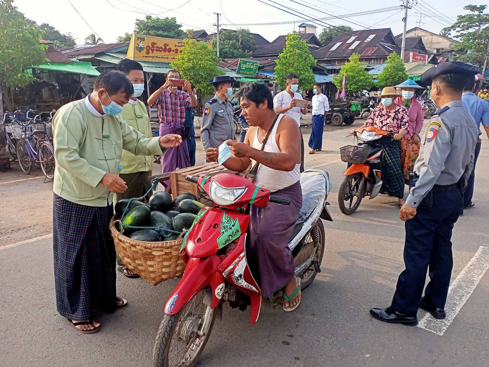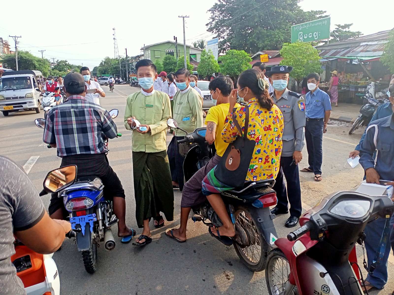 ထိုသို့ဆောင်ရွက်ရာတွင် မြို့နယ်စီမံအုပ်ချုပ်ရေးအဖွဲ့ဥက္ကဋ္ဌ ဦးကျော်ဆန်းဦးနှင့်အဖွဲ့ဝင်များ၊ မြို့နယ်အမျိုးသမီးရေးရာနှင့် မိခင်နှင့်ကလေးစောင့်ရှောက်ရေးအသင်းဥက္ကဋ္ဌ ဒေါ်သင်းသင်းခိုင်နှင့်အဖွဲ့ဝင်များ၊ ဌာနဆိုင်ရာများ၊ ရပ်ကွက်အုပ်ချုပ်ရေးမှူးများ၊ NGOများ၊ စျေးအကျိုးတော်ဆောင်အဖွဲ့များက စျေးရောင်းချသူများ၊ စျေးသွားစျေးလာများအား Mask များ ဝေငှပြီးပြည်သူများအနေဖြင့် ကိုဗစ်-၁၉ ရောဂါကူးစက်မှုကို ကာကွယ်နိုင်ရေးအတွက် နေအိမ်ပြင်ပသို့ သွားလာပါက ပါးစပ်နှင့် နှာခေါင်းစည်း Mask ကို စနစ်တကျ တပ်ဆင်ရန်၊ လက်ကို မကြာခဏဆေးကြောရန်၊ လူစုလူဝေးရှောင်ရှားရန်၊ တစ်ဦးနှင့်တစ်ဦး ခပ်ခွာခွာနေထိုင်ရန်တို့ကို အသိပညာပေး ပြောကြားခဲ့သည်။ဆက်လက်၍ မြို့နယ်မီးသတ်တပ်ဖွဲ့ရုံးရှေ့နှင့် ဒရယ်မီးလမ်းဆုံတို့၌ Mask များ ဝေငှခဲ့ကြောင်းသိရသည်။