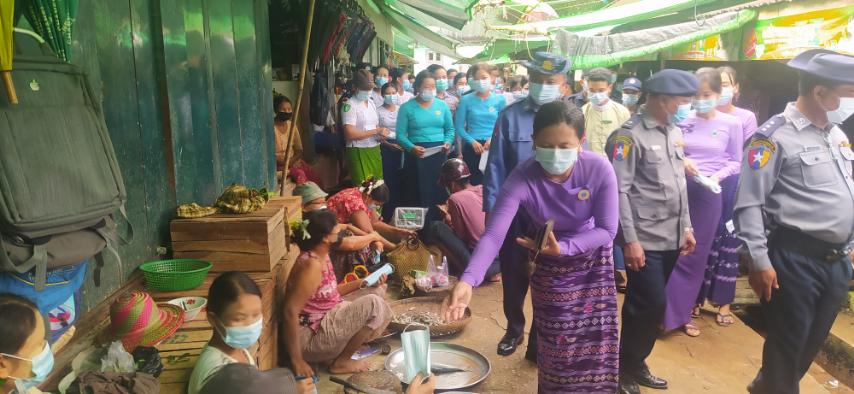 ကိုဗစ်-၁၉ မျိုးရိုးဗီဇပြောင်း အိုမီခရွန်ရောဂါ ကူးစက်မှုကြိုတင် ကာကွယ်ထိန်းချုပ်နိုင်ရေးအတွက် မြို့မစျေး အတွင်းတွင် လက်ဆေးဘေစင်များထားရှိမှု၊ သတိပေးဆိုင်းဘုတ်များ တပ်ဆင်ထားရှိမှု အခြေအနေအား မြို့နယ်စီမံအုပ်ချုပ်ရေးအဖွဲ့၊ အဖွဲ့ဝင်(၁) ဗိုလ်မှူး ဖြိုးသူရကျော်က ကွင်းဆင်းကြည့်ရှုစစ်ဆေးခဲ့ပြီး မြို့နယ် အထွေထွေအုပ်ချုပ်ရေးဦးစီးဌာန၊ မြို့နယ်စည်ပင်သာယာရေးအဖွဲ့၊ ကျန်းမာရေးဦးစီးဌာန၊ မြန်မာနိုင်ငံရဲတပ်ဖွဲ့၊ မြို့နယ်မီးသတ် တပ်ဖွဲ့၊ ပညာရေးဦးစီးဌာနမှ ဝန်ထမ်းများ၊ မြို့နယ်မိခင်နှင့် ကလေးစောင့်ရှောက်ရေးအသင်း၊ အမျိုးသမီးရေးရာအသင်းဝင်များမှ စုပေါင်းပြီး စျေးသူစျေးသားများ၊ စျေးဝယ်လာကြသူများအား Mask များ ဖြန့်ဝေပေးခဲ့ကြောင်း သိရသည်။