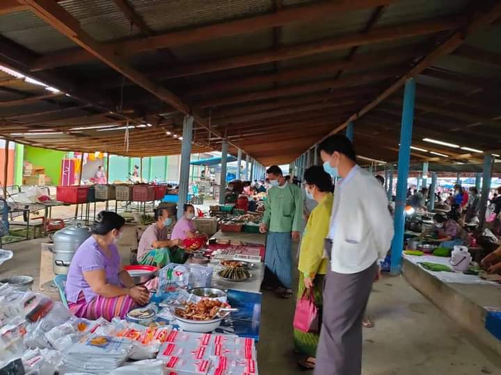 စစ်ဆေးရာတွင် မြို့နယ်ကိုဗစ်-၁၉ ရောဂါ ကာကွယ်၊ ထိန်းချုပ်၊ ကုသရေးလုပ်ငန်း ကော်မတီဥက္ကဋ္ဌ မြို့နယ်အုပ်ချုပ်ရေးမှူး ဦးညီညီဝင်း၏ ကြီးကြပ်မှုဖြင့် နေ့ပိုင်းဖွင့်လှစ် ရောင်းချသည့် ဈေးဆိုင်များ စစ်ဆေးမှုကြီးကြပ်ရေးအဖွဲ့ မြို့နယ်စီမံကိန်းဦးစီးရုံး လက်ထောက် ညွှန်ကြားရေး မှူး ဒေါ်နန်းဆေးယျ၊ ဒေါက်တာဟန်စိုး၊ အထွေထွေအုပ်ချုပ်ရေးဦးစီးဌာန ဒုတိယဦးစီးမှူး ဦးသက်ခိုင်၊ စည်ပင်သာယာရေးဌာနမှ တာဝန်ခံ အင်ဂျင်နီယာ ဦးစိုင်းဟိန်းလွှမ်းမိုး နှင့် တာဝန်ရှိသူများ ပါဝင်၍ ဈေးအတွင်း ဈေးရောင်း၊ ဈေးဝယ်သူများအား ကိုဗစ်-၁၉ ရောဂါ ကြိုတင်ကာကွယ်ရေး ကျန်းမာရေးနှင့်အားကစား ဝန်ကြီးဌာန၏ ညွှန်ကြားချက်အတိုင်း လိုက်နာရေး၊ ဈေးအတွင်း ဝင်ရောက်သူတိုင်း နှာခေါင်းစည်း (Mask) တပ်ဆင်ရေးတို့ကို လိုက်လံစစ်ဆေးပြီး နှာခေါင်းစည်းတပ်ရန် လိုက်နာမှုမရှိသူများအား ဒဏ်ပေးသည့် စနစ်ဖြင့် နှာခေါင်းစည်း(Mask) ဝယ်ယူတပ်စေခြင်းများလည်း ဆောင်ရွက်ခဲ့ကြ ကြောင်း သိရသည်။