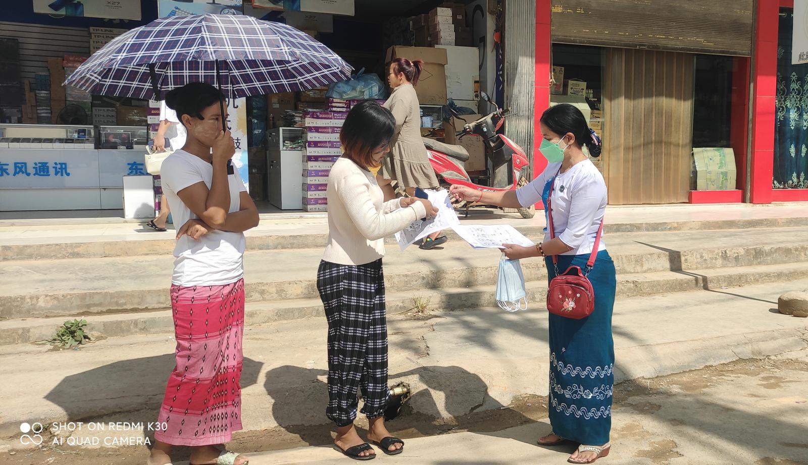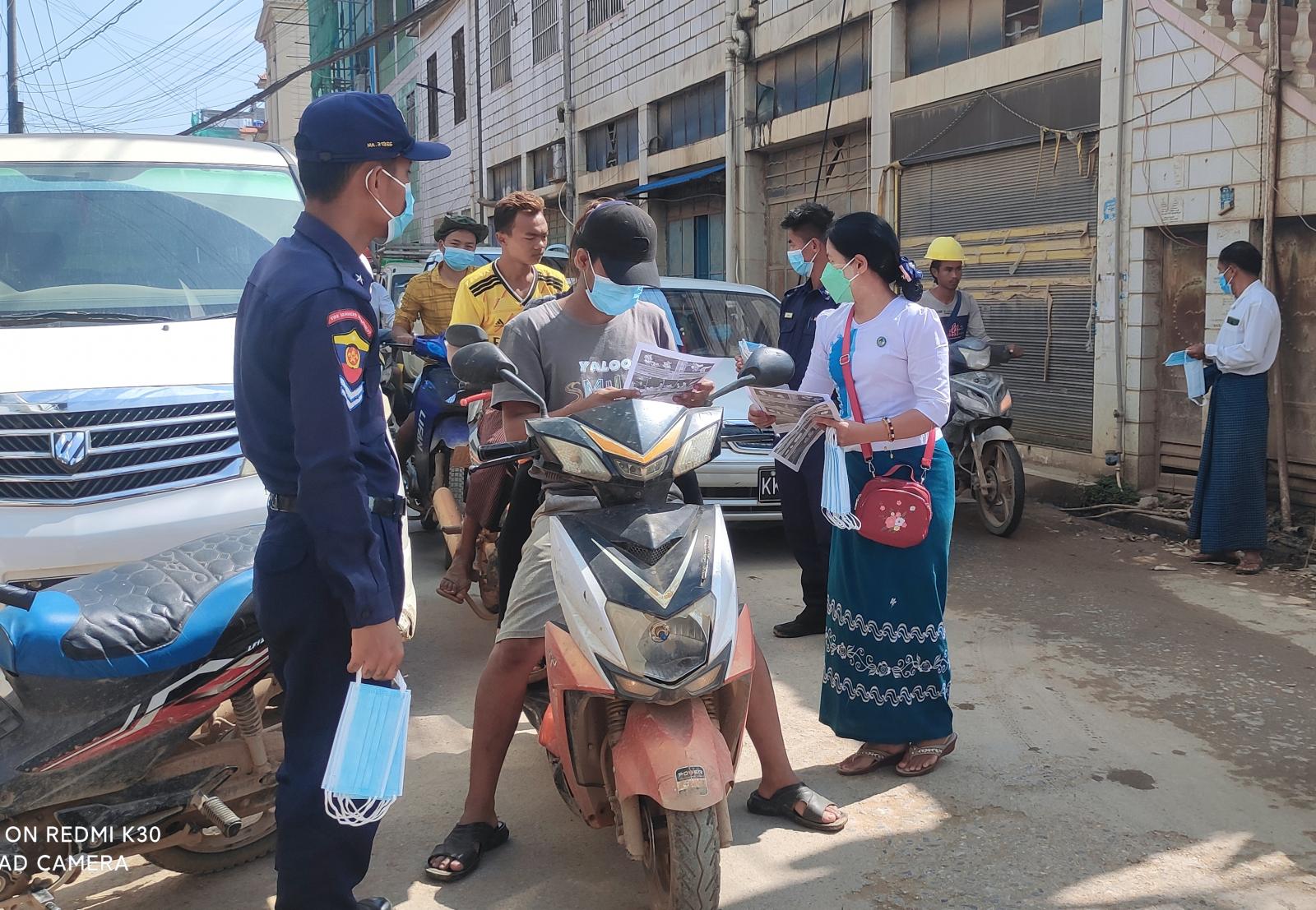 ယင်းသို့ အသိပညာပေးလုပ်ငန်းများဆောင်ရွက်ရာတွင် လောက်ကိုင်မြို့နယ် မြို့နယ်စီမံအုပ်ချုပ်ရေး အဖွဲ့ ဥက္ကဋ္ဌ ဦးသိန်းဇော်ဦးနှင့် အဖွဲ့ဝင်များ၊ မြို့နယ်ရဲတပ်ဖွဲ့ဝင်များ၊ ကျန်းမာရေးဝန်ထမ်းများ၊ ဌာနဆိုင်ရာများ၊ မီးသတ်တပ်ဖွဲ့ဝင်များ၊ ရပ်ကွက်အုပ်ချုပ်ရေးမှူးများက မြို့အတွင်းရှိလူစည်ကားရာ နေရာများဖြစ်သည့် အမှတ်(၁)ရပ်ကွက်၊ အမှတ်(၂)ရပ်ကွက်နှင့် အမှတ်(၃)ရပ်ကွက်များတွင် ကိုဗစ်-၁၉ ရောဂါ ကြိုတင်ကာကွယ်ထိန်းချုပ်ရေး နည်းလမ်းများကို အသိပညာပေးနှိုးဆော်ပြောကြားပြီး လက်ကမ်းစာစောင်နှင့် နှာခေါင်းစည်း Maskများကို အခမဲ့ဖြန့်ဝေပေးခဲ့ကြကြောင်း သိရသည်။