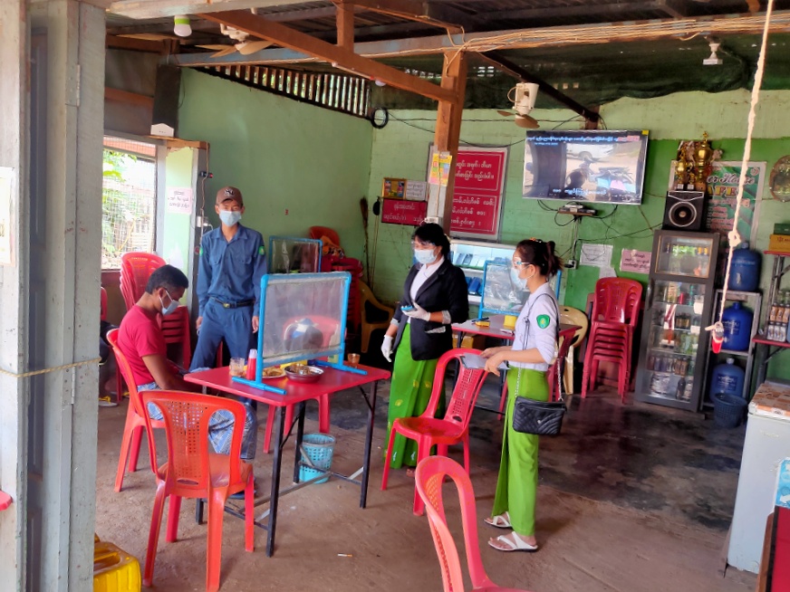 ထိုသို့ စစ်ဆေးဆောင်ရွက်ရာတွင် မြို့နယ်ခွဲစည်ပင်သာယာရေး ဌာနမှတာ၀န်ခံ ဦးလူထွန်း ဦးဆောင်သော အဖွဲ့မှ စားသောက်ဆိုင်များနှင့် လ္ဘက်ရည်ဆိုင်များတွင်လက်ဆေး ဘေစင်နှင့် လက်သန့်ဆေးရည်များ ထားရှိခြင်း ရှိ/ မရှိ၊ ဆိုင်ပိုင်ရှင်များ (Mask) တပ်ဆင်ရေးနှင့် စားသုံးသူ များအား တစ်ဦးနှင့်တစ်ဦး သတ်မှတ်အကွာ အဝေးများ ထားရှိခြင်း ရှိ/မရှိ တို့ကို စစ်ဆေးခဲ့ပြီး ကျန်းမာရေးနှင့် အားကစားဝန်ကြီးဌာနက ထုတ်ပြန်ထားသည့် စည်းကမ်းချက်များအပေါ် လိုက်နာဆောင်ရွက်မှုများ မရှိပါက အရေးယူဆောင်ရွက်သွားမည်ဖြစ်ကြောင်း သိရသည်။