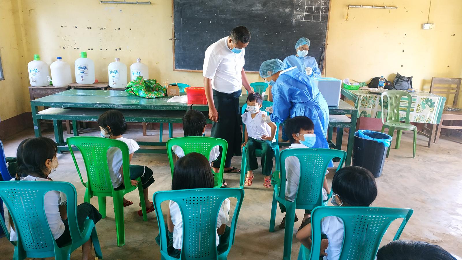 ကာကွယ်ဆေးထိုးနှံပေးရာတွင် ပြည်သူ့ကျန်းမာရေးဦးစီးဌာနမှ မြို့နယ်သူနာပြုအဆင့်-၁ ဒေါ်ဥမ္မာဝင်းနှင့် ကျန်းမာရေးဝန်ထမ်းများ၊ ကျောင်းအုပ်ဆရာမကြီးနှင့် ဆရာဆရာမများပူးပေါင်း၍ မြို့ပေါ်ကျောင်း(၈)ကျောင်းမှအသက်(၅) နှစ်မှ(၁၂)နှစ်အထက်ကျောင်းသား/ သူ(၁၁၅)ဦးအား (ဒုတိယအကြိမ်) ကိုဗစ်-၁၉ ရောဂါကာကွယ်ဆေးထိုးနှံပေးခဲ့ကြောင်း သိရသည်။