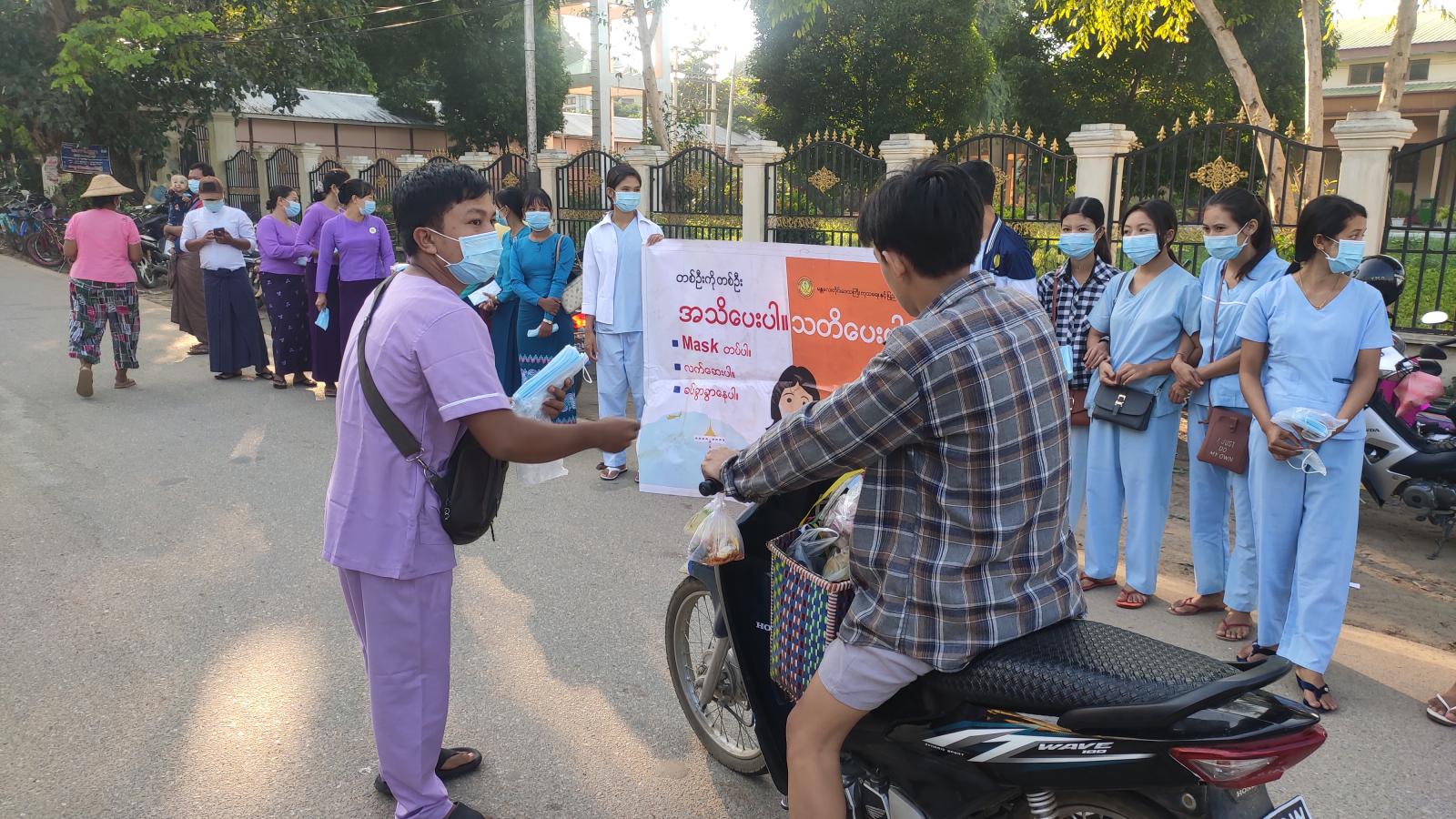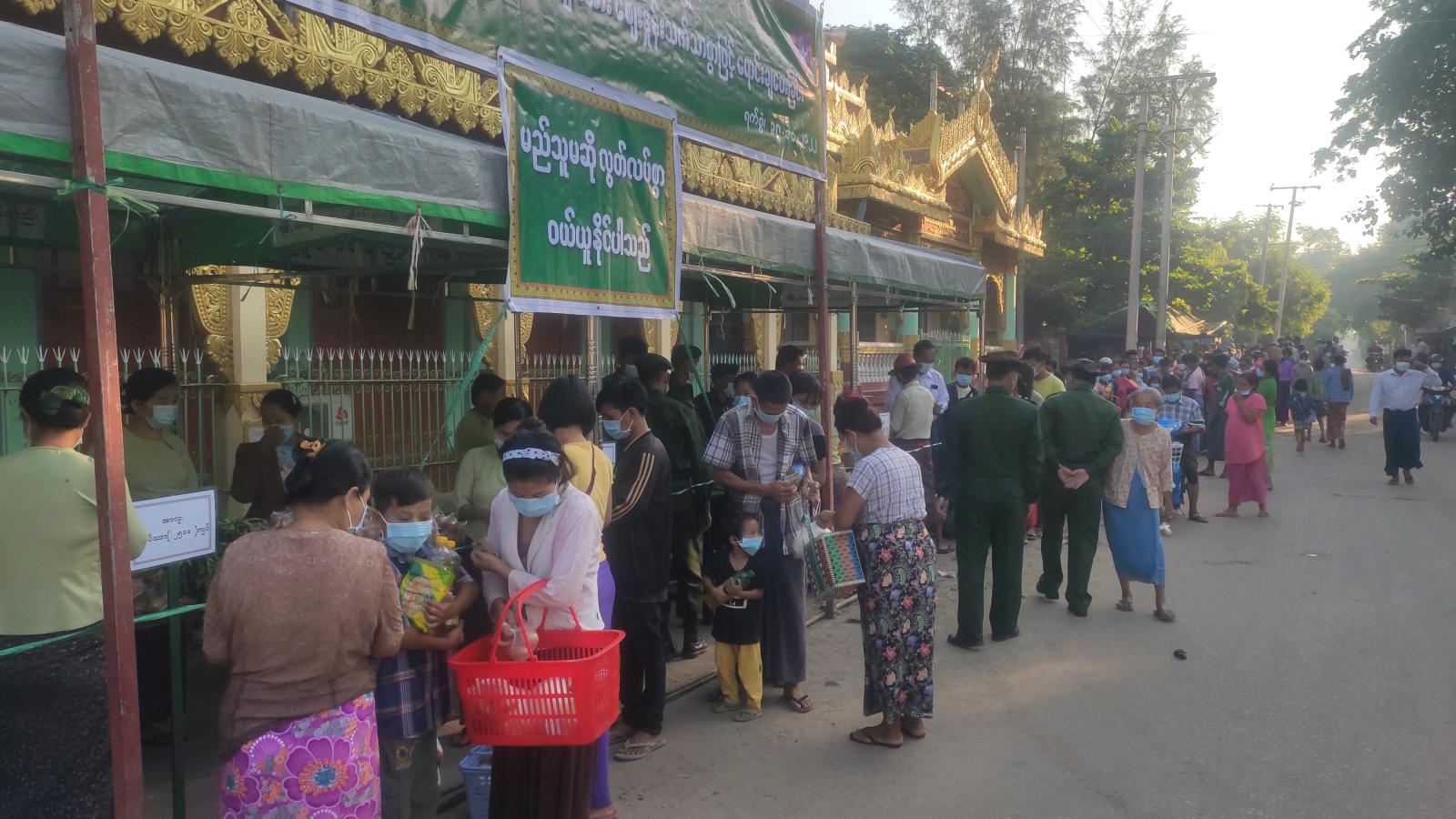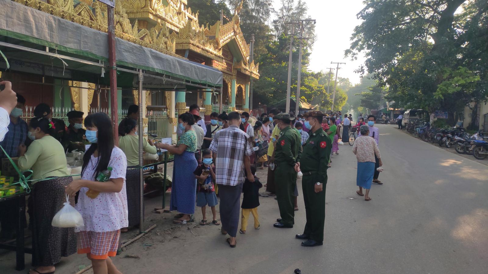 အခြေခံစားသောက်ကုန် ဆန်၊ဆီ၊ကြက်ဉ၊ အာလူး၊ ကြက်သွန်နီနှင့် ဟင်းသီးဟင်းရွက်တို့ကို ဈေးနှုန်းသက်သာစွာဖြင့် ရောင်းချပေးနေခြင်းကို ရမည်းသင်းမြို့ အမှတ်(၃)စစ်အခြေခံတပ်၊ ဒုတိယဗိုလ်မှူးကြီး ကျော်ဇင်ထက်၊ခရိုင်/မြို့နယ်အထွေထွေအုပ်ချုပ်ရေး ဦးစီးဌာနဝန်ထမ်းများ၊ မြို့နယ်ပြည်သူ့ကျန်းမာရေးဦးစီးဌာန၊ ဝန်ထမ်းများက ကိုဗစ်ရောဂါကာကွယ်ရေးနည်းလမ်းများနှင့်အညီ နှာခေါင်းစည်း(Mark)များ၊ အသိပညာပေးလက်ကမ်းစာစောင်များကို အခမဲ့ဖြန့်ဝေပေးခဲ့ကြောင်း သိရသည်။