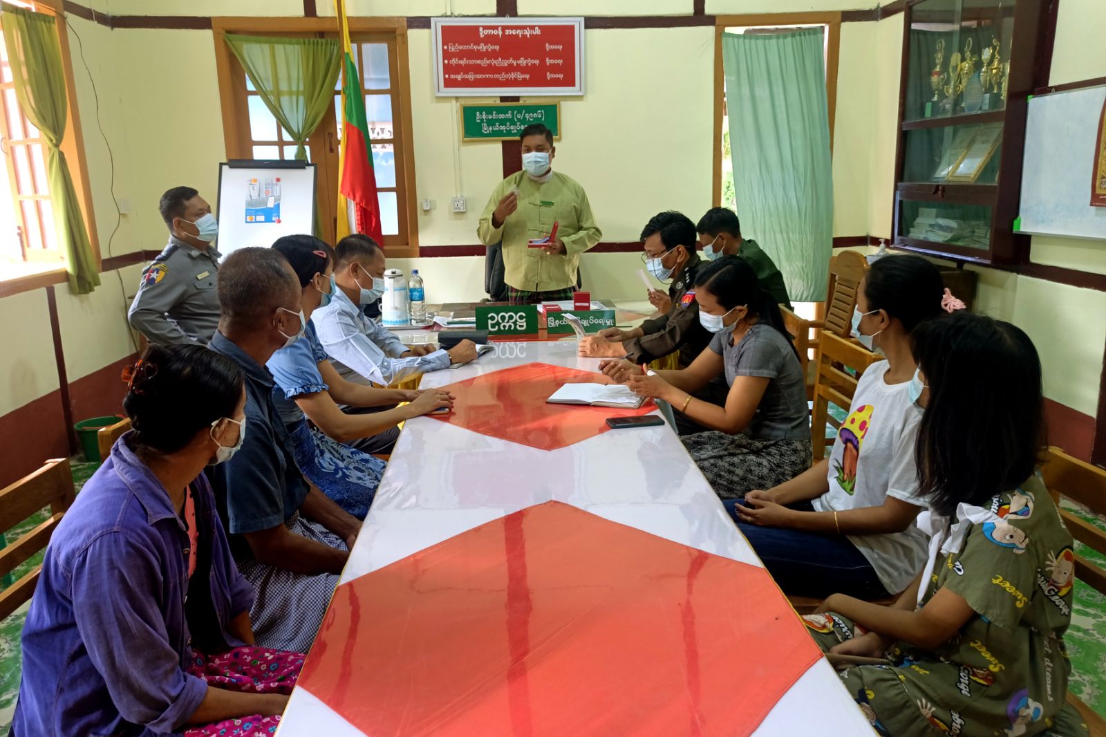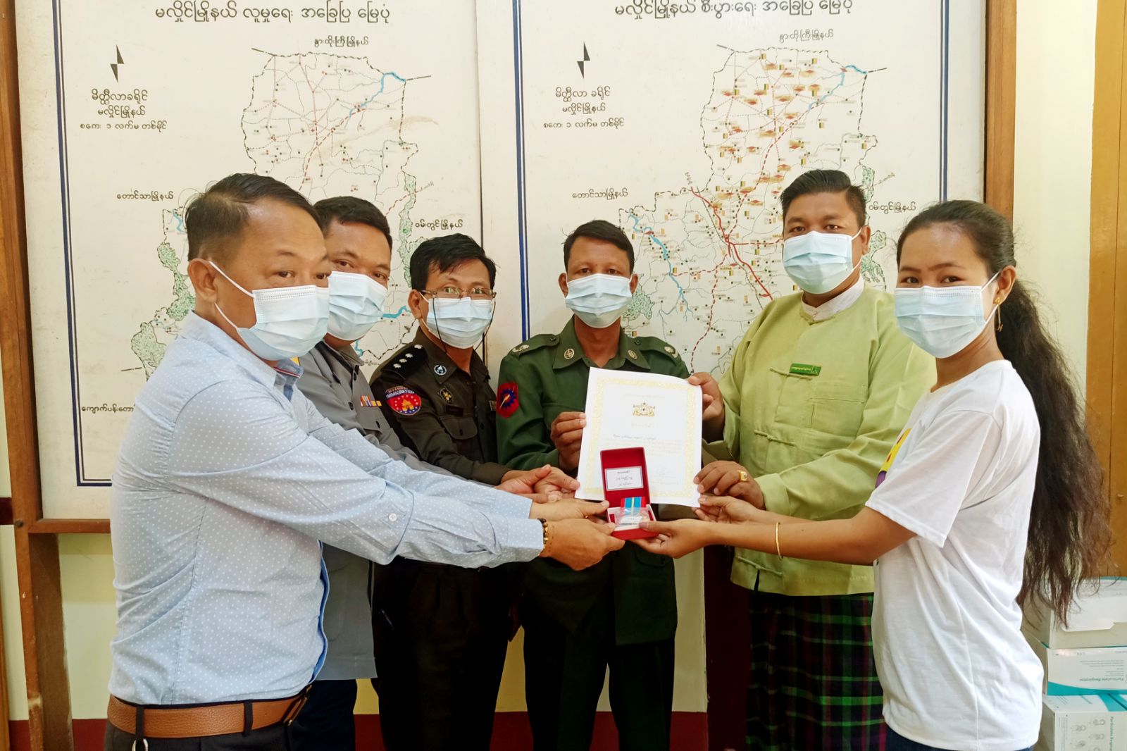 အခမ်းအနားတွင် မြို့နယ်စီမံအုပ်ချုပ်ရေးအဖွဲ့ဥက္ကဋ္ဌ၊ မြို့နယ်အုပ်ချုပ်ရေးမှူးဦးစိုးမင်းထက်က လုံခြုံရေးနှင့်တရားဥပဒေစိုးမိုးရေ တာဝန်အရပ် ရပ်ကို ထမ်းဆောင်ရာတွင် ခိုင်မြဲသောစိတ်ဓာတ်ဖြင့် ရဲဝံ့စွာဆောင်ရွက်ခဲ့သော ရာအိမ်မှူး(၁)ဦး၊ ကျေးရွာအုပ်စုအုပ်ချုပ်ရေးမှူး(၂)ဦးတို့အား နိုင်ငံတော် စီမံအုပ်ချုပ်ရေးကောင်စီ၏ ၂၀၂၂ခုနှစ်၊ မတ်လ(၂၇)ရက်(တပ်မတော်နေ့)တွင် အမိန့်ကြော်ငြာစာ အမှတ်(၅၄/၂၀၂၂)ဖြင့် ချီးမြှင့်အပ် နှင်းခဲ့သည့် မြန်မာနိုင်ငံရဲတပ်ဖွဲ့ဆိုင်ရာ စွမ်းရည်သတ္တိ ဂုဏ်ထူးဆောင်တံဆိပ်ဖြစ်သည့် ရွှေဖြင့်ပြုလုပ်ထားသော ရဲဗလတံဆိပ်အားချီးမြှင့်ခြင်း အား မိမိတို့အဖွဲ့အနေဖြင့် ကျန်ရစ်သူမိသားစုတို့အား ထပ်ဆင့်ချီးမြှင့်ပေးအပ်ခြင်းဖြစ်ကြောင်း၊ မိသားစုဝင်များအနေဖြင့် လိုအပ်သည်များရှိပါက အချိန်မရွေးအကူအညီတောင်းခံနိုင်ပါကြောင်း အားပေးစကားများ ပြောကြားခဲ့သည်။
