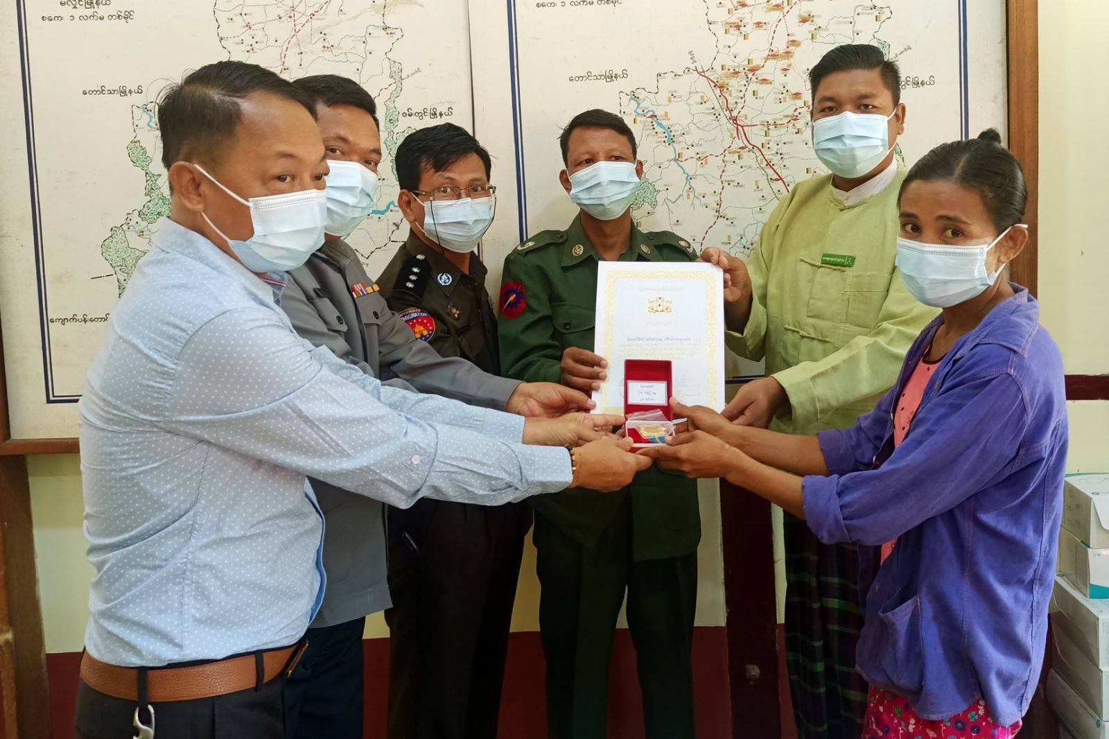 ထို့နောက် နိုင်ငံတော်တာဝန်ထမ်းဆောင်ရင်း သေဆုံးသွားခဲ့သော ရာအိမ်မှူးနှင့် ကျေးရွာအုပ်စု အုပ်ချုပ်ရေးမှူးတို့၏ မိသားစုဝင်တို့အား ရဲဗလတံဆိပ် ဂုဏ်ပြုမှတ်တမ်းလွှာနှင့် ရွှေတံဆိပ်တို့အား မြို့နယ်စီမံအုပ်ချုပ်ရေးအဖွဲ့ဥက္ကဋ္ဌ ဦးစိုးမင်းထက်၊ အဖွဲ့ဝင်များဖြစ်ကြသော ဗိုလ်မှူး ဌေးသန်း၊ ဦးအောင်ကျော်သူ၊ အတွင်းရေးမှူး ရဲမှူးသိန်းဇော်တို့က ထပ်ဆင့်ချီးမြှင့်ပေးခဲ့ကြောင်း သိရသည်။