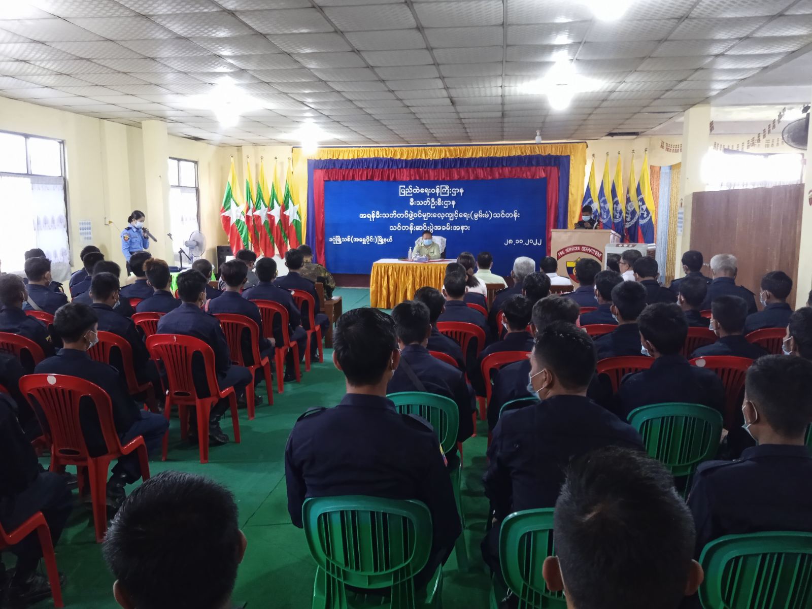 ရှေးဦးစွာ အရန်မီးသတ်တပ်ဖွဲ့ဝင်များ လေ့ကျင့်ရေး(မွမ်းမံ)သင်တန်းဆင်းပွဲတွင် မြို့နယ်စီမံအုပ်ချုပ်ရေးအဖွဲ့၊ မြို့နယ်မီးဘေးလုံခြုံရေးအဖွဲ့ဥက္ကဋ္ဌ ဦးမျိုးသူကသင်တန်းဆင်းအမှာစကားပြောကြားရာတွင် စေတနာ၊ ဝါသနာ၊ အနစ်နာဖြင့် နာသုံးနာအခြေခံပြီး အမိန့်နာခံမှု၊ မီးငြိမ်းသတ်ရာတွင်ဥပဒေ၊ နည်းဥပဒေ၊ စည်းမျဉ်းစည်းကမ်းများအတိုင်း လိုက်နာဆောင်ရွက်တတ်စေရန်နှင့် ကယ်ဆယ်ရေးအပိုင်းများ၊ မီးဘေးနှင့် သဘာဝဘေးဖြစ်ပေါ်လာပါကပျက်စီးဆုံးရှုံးမှု နည်းပါးစေရန် ယခုသင်တန်းကလက်တွေ့သင်ကြားမှုများအား မိမိတို့ဒေသတွင်ထိရောက်စွာ အသုံးချစေလိုကြောင်း၊ မီးသတ်တပ်ဖွဲ့ဝင်များ လိုက်နာစောင့်ထိန်းရမည်ကျင့်ဝတ်(၁၀၂)ပါးနဲ့အညီ ကျင့်ကြံ၍မီးသတ်တပ်ဖွဲ့ရည်မှန်းချက်ဖြင့် မီးဘေးလုံခြုံရေး၊ သဘာဝဘေးအန္တရာယ်ကြိုတင်ကာကွယ်ရေးလုပ်ငန်းများ ကူညီဆောင်ရွက်နိုင်ရေးပြောကြားခဲ့သည်။