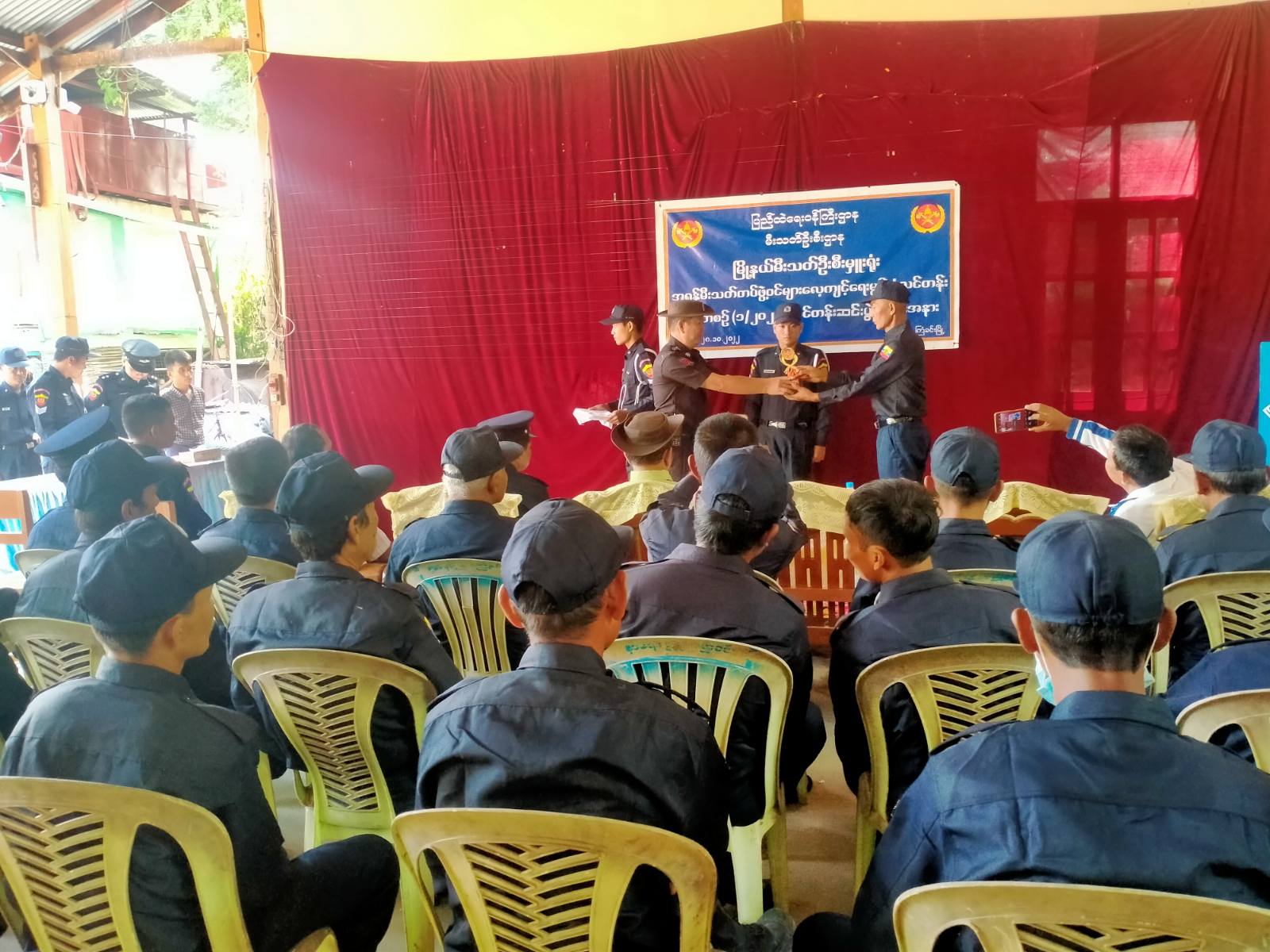 ရှေးဦးစွာမြို့နယ် စီမံအုပ်ချုပ်ရေးအဖွဲ့ဥက္ကဋ္ဌ ဦးသိန်းတန်မှ သင်တန်းဆင်းမိန့်ခွန်းပြောကြားပြီးနောက်၊ အရန် မီးသတ်တပ်ဖွဲ့ဝင်များ လေ့ကျင့်ရေး(မွမ်းမံ)သင်တန်းတွင် ဆုရရှိကြသော ကြို့ပင်စုကျေးရွာ တပ်စုမှူး အောင်အောင်မှ စစ်ရေးပြ(ပထမဆု) ကိုလည်းကောင်း၊ ရေနံတောင်ကျေးရွာ တပ်သားချစ်ကိုကိုက မီးသတ်ပညာ(ဒုတိယဆု)ကိုလည်းကောင်း၊ ပိန္နဲကွင်းကျေးရွာ တပ်ခွဲမှူးဦးလှဝင်းက ရှာဖွေကယ်ဆယ်ရေး (တတိယဆု)များ ရရှိကြပြီး ဆုရသူများအား မြို့နယ်စီမံအုပ်ချုပ်ရေးအဖွဲ့ဥက္ကဋ္ဌနှင့် အဖွဲ့ဝင်များ၊ မြို့နယ်အဆင့် ဌာနဆိုင်ရာမှ တာဝန်ရှိသူများက ဆုများနှင့် သင်တန်းဆင်းလက်မှတ်များ ချီးမြှင့်ပေးအပ်ကြသည်။