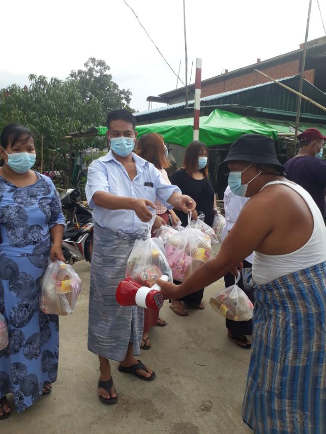 ထို့သို့လှူဒါန်းရာတွင် Lock Down ချသည့် ရပ်ကွက်များအတွင်းရှိ လမ်းများအတွင်း လတ်တလော စားဝတ်နေရေးအဆင်ပြေစေရန် Quarantine ဝင်နေသော အိမ်ထောင်စုများအား ဘုန်းတော်ကြီးသင် ပညာရေးကျောင်းတိုက်ဆရာတော်၊ ပရဟိတအသင်းအဖွဲ့များနှင့် ရပ်ကွက်အတွင်းနေ စေတနာရှင်ပြည် သူများမှ ဆန်၊ ဆီ၊ ကြက်သွန်နီ၊ ကြက်ဥ၊ ငါးသေတ္တာဘူး၊ ခေါက်ဆွဲခြောက်ထုပ်၊ အချိုမှုန့်များ၊ နှာခေါင်းစည်း Masks များ၊ အသီးသီးလာရောက်လှူဒါန်းပေးခဲ့ကြောင်း သိရသည်။