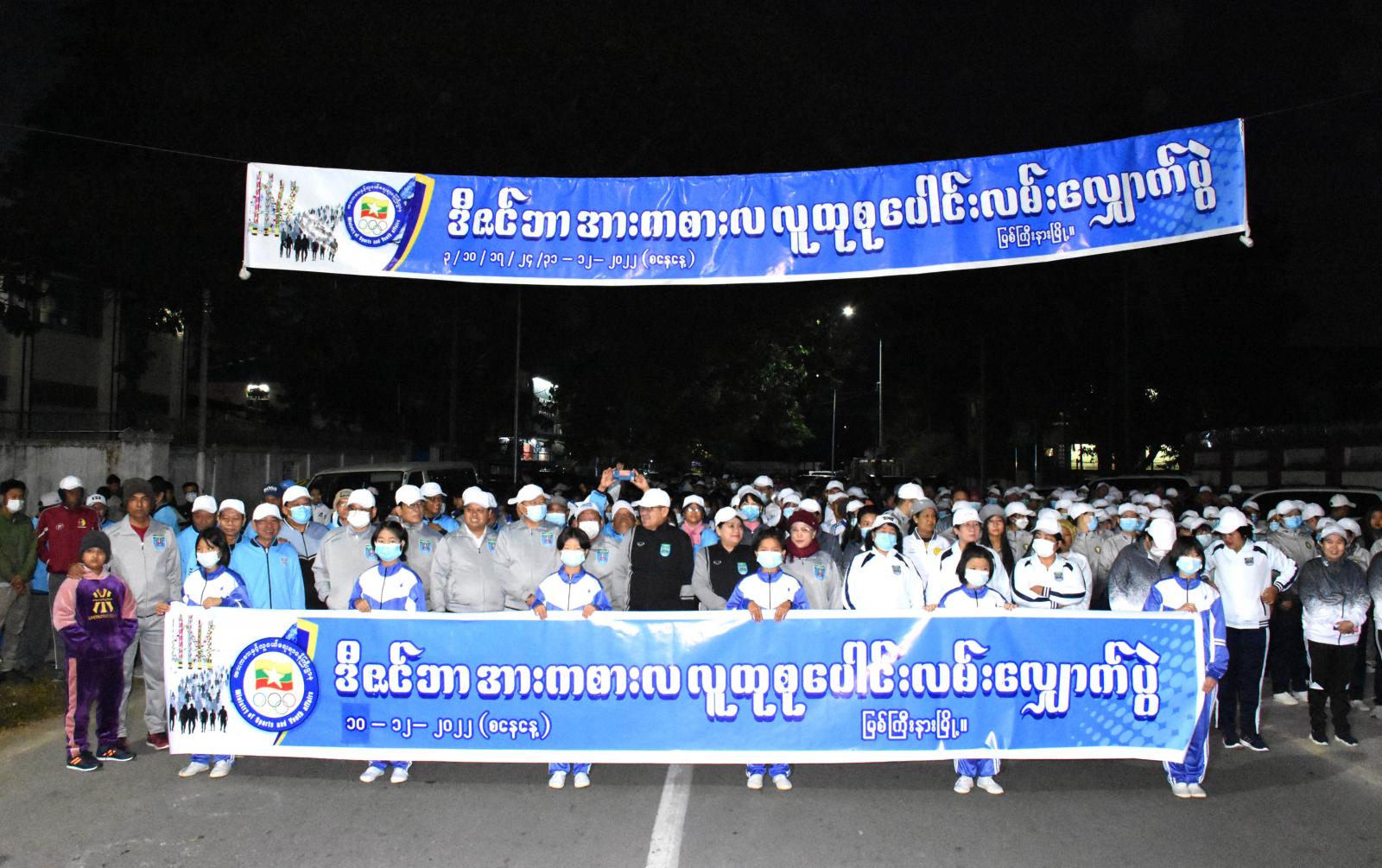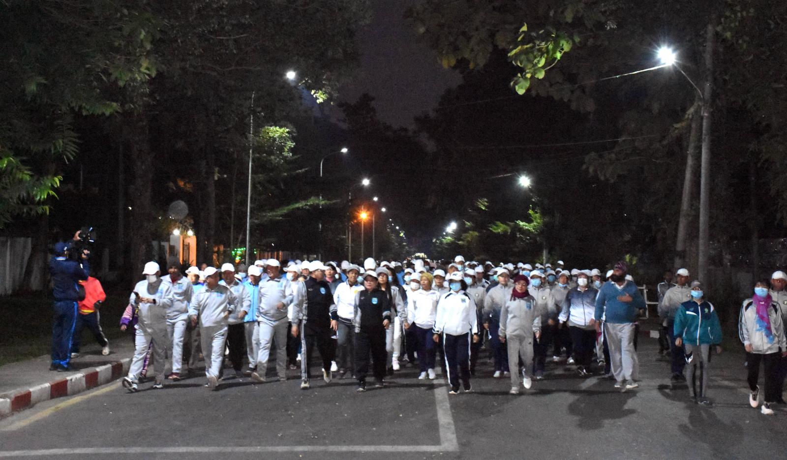 ရှေးဦးစွာ လူထုစုပေါင်းလမ်းလျှောက်ပွဲကို ပြည်နယ်ပြည်သူ့အားကစားကွင်းရှေ့စုရပ်မှ စတင်တာလွှတ်ရာ ပြည်နယ်ဝန်ကြီးချုပ် ဦးခက်ထိန်နန်နှင့် ဇနီးဒေါ်နန်ဆိုင်း၊ ပြည်နယ်တရားလွှတ်တော် တရားသူကြီးချုပ်နှင့် ဇနီး၊ ပြည်နယ်အစိုးရအဖွဲ့ဝင် ဝန်ကြီးများနှင့် ၎င်းတို့၏ ဇနီးများ၊ ပြည်နယ် ဥပဒေချုပ်၊ ပြည်နယ်/ ခရိုင်/ မြို့နယ်အဆင့်ဌာနဆိုင်ရာများ၊ ကျောင်းသား/ကျောင်းသူများ၊ ရပ်ကွက်နေပြည်သူများ စုပေါင်း၍ အား/ကာတိုက်တန်းလမ်းမှ ရုံးကြီးလမ်းတစ်လျှောက်၊ ထိုမှတစ်ဆင့် သခင်နက်ဖေလမ်းအတိုင်း ပြည်သူ့အားကစားကွင်းအတွင်းသို့ ဝင်ရောက်ကာ တစ်ပျော်တစ်ပါး စုပေါင်းလမ်းလျှောက်ခဲ့ကြသည်။