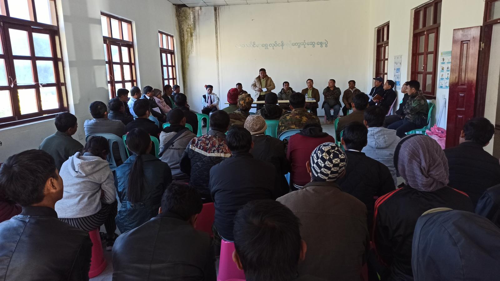 ဆက်လက်၍ မွန်းလွှဲပိုင်းတွင် နုဇုန်ဘောင်တိုက်နယ်ဆေးရုံခန်းမဆောင်တွင် ကျေးရွာ၊ ကျေးရွာအုပ်စုများမှ အုပ်ချုပ်ရေးမှူးများ၊ ဒေသခံပြည်သူများနှင့်တွေ့ဆုံရာ ခရိုင်စီမံအုပ်ချုပ်ရေး အဖွဲ့ဥက္ကဋ္ဌ ဦးသက်နိုင်က အမှာစကားပြောကြားရာတွင် မိမိတို့ဒေသအား ခရိုင်အဆင့်သို့ နိုင်ငံတော်အစိုးရမှတိုးမြှင့်ဖွဲ့စည်းခဲ့သဖြင့် ရပ်ကွက်၊ ကျေးရွာ၊ ကျေးရွာအုပ်စုများ ခရိုင်အဆင့်နှင့်လျော်ညီစွာ ဖွံ့ဖြိုးတိုးတက်လာနိုင်အောင် ယခုလိုကျေးရွာများအထိ ကွင်းဆင်း၍ ဒေသခံမိဘပြည်သူများနှင့်တွေ့ဆုံ၍ ဒေသ၏အခက်အခဲ၊ လိုအပ်ချက်များကိုသိရှိနိုင်ရန်နှင့် ဒေသဖွံ့ဖြိုးတိုး တက်ရေးလုပ်ငန်းကို ဆောင်ရွက်နိုင်ရန်ဖြစ်ပါကြောင်း၊ ဒေသဖွံ့ဖြိုးရေး လုပ်ငန်းများ ဆောင်ရွက်ရာတွင် ရပ်ရွာအေးချမ်းသာယာရေး၊ တရားဥပဒေစိုးမိုးရေး၊လုံခြုံရေးကောင်းမှသာ ဖွံ့ဖြိုးရေး လုပ်ငန်းများကို အရှိန်အဟုန်မပြတ်ဆောင်ရွက်နိုင်မှာဖြစ်ပါကြောင်း၊ ဒေသတည်ငြိမ်အေးချမ်းရေးအတွက် ပြည်သူများအနေဖြင့် ဆက်လက် ဝိုင်းဝန်းဆောင်ရွက်ရန် လိုအပ်ပါကြောင်းနှင့် ပညာရေး၊ ကျောင်းများကောင်းမွန်စေရေးနှင့် ကျန်းမာရေး၊ လူမှုရေး၊ စိုက်ပျိုးမွေးမြူရေး၊ လမ်းတံတားများ လိုအပ်ချက်များရှိပါက ပွင့်ပွင့်လင်းလင်းတင်ပြနိုင်ပါကြောင်း ပြောကြားသည်။