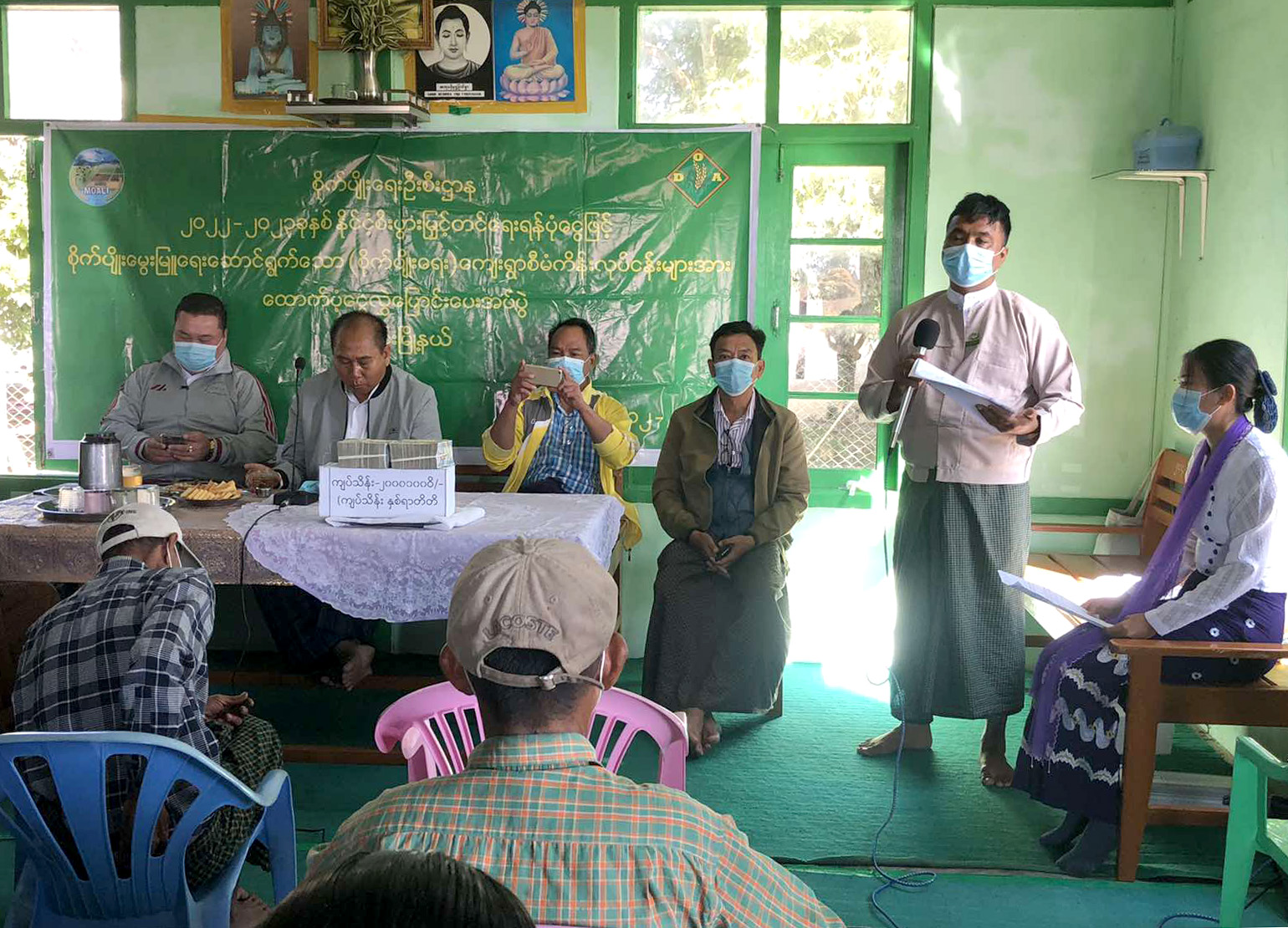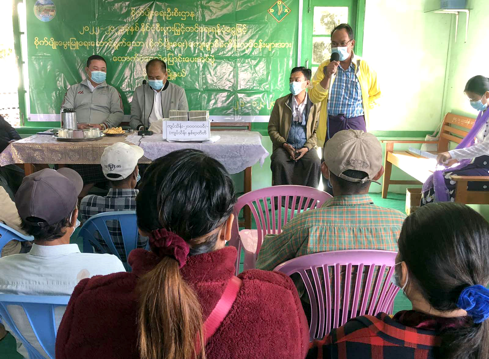 ဆက်လက်၍ မြို့နယ်စိုက်ပျိုးရေးဦးစီးဌာနမှ မြို့နယ်ဦးစီးမှူး ဦးတင့်မျိုးကိုက စိုက်ပျိုးမွေးမြူရေး ဆောင်ရွက်လျက်ရှိသော (စိုက်ပျိုးရေး)ကျေးရွာစီမံကိန်း လုပ်ငန်းများအတွက် ချေးငွေများနှင့် ပတ်သက်၍ စီမံကိန်းဆိုင်ရာလုပ်ငန်းများကို ရှင်းလင်းပြောကြားခဲ့သည်။