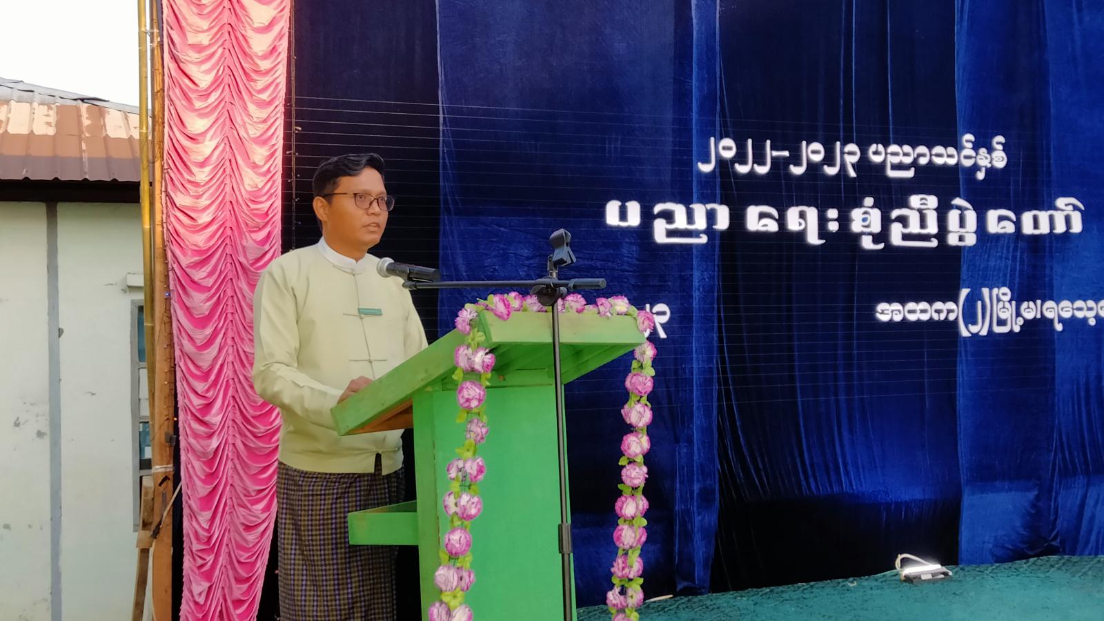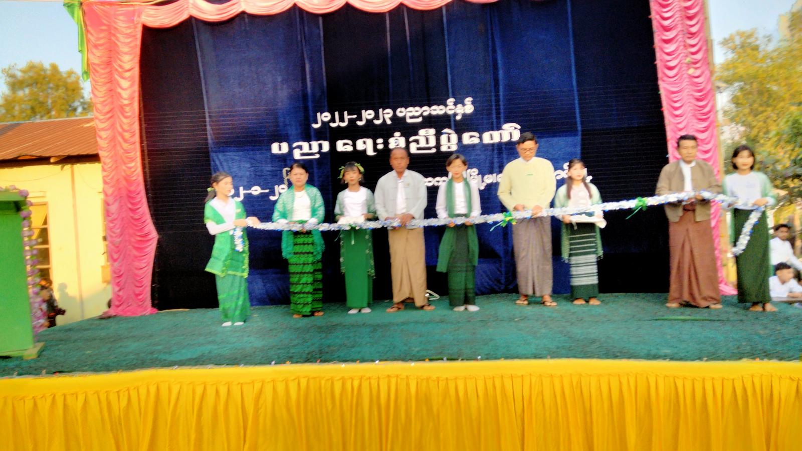 ရှေးဦးစွာ အခမ်းအနားကို မြို့နယ်စီမံအုပ်ချုပ်ရေးကောင်စီအဖွဲ့ဥက္ကဋ္ဌ ဦးနိုင်လင်းထက်နှင့် မြို့နယ်ပညာရေးမှူး၊ ကျောင်းအကျိုးတော်ဆောင်အဖွဲ့တို့မှ ဖဲကြိုးဖြတ်ဖွင့်လှစ်ခဲ့သည်။