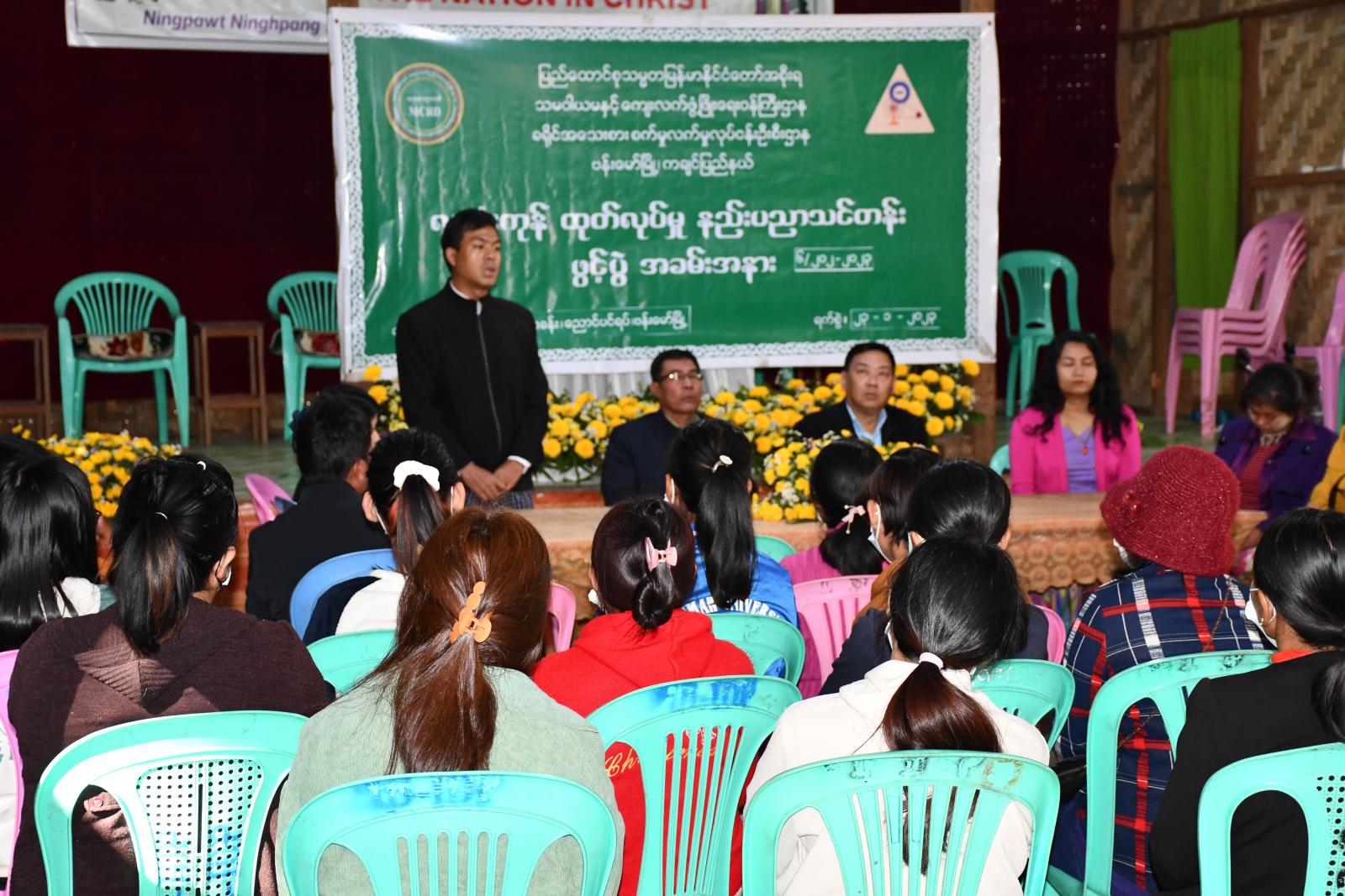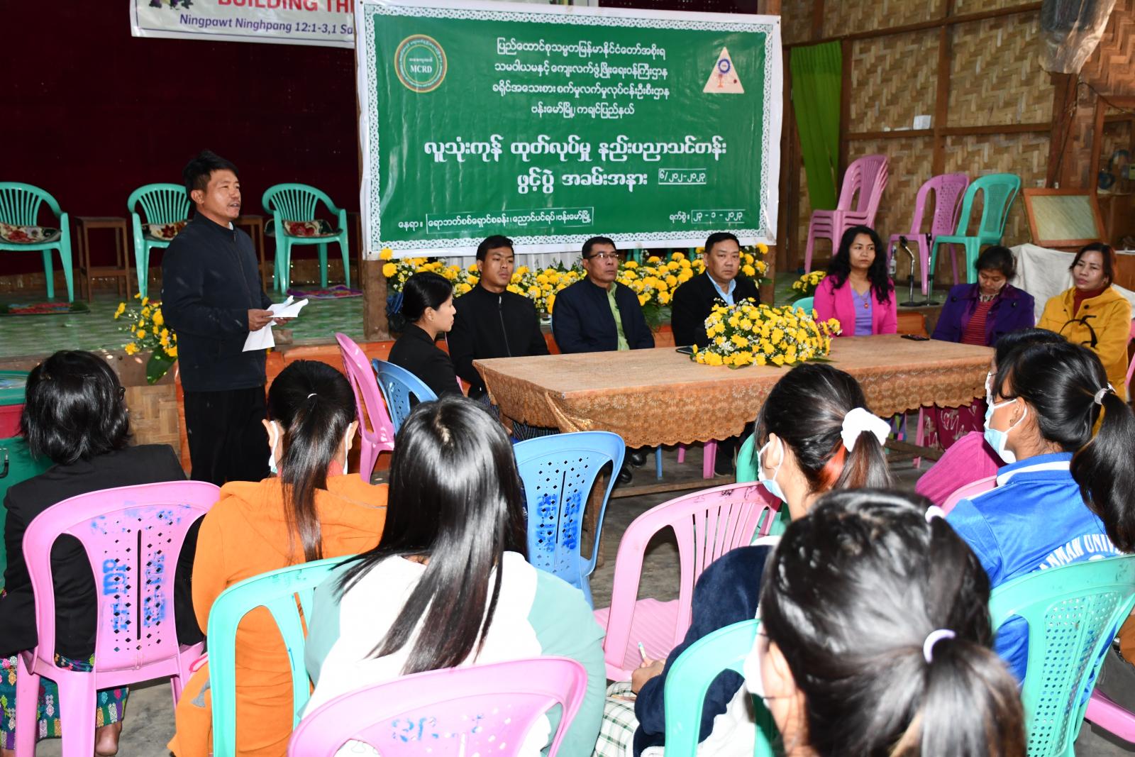 အဆိုပါအခမ်းအနားတွင် ခရိုင်အထွေထွေအုပ်ချုပ်ရေးဦးစီးဌာနမှ ဒုတိယခရိုင်အုပ်ချုပ်ရေးမှူး ဦးသိန်းစိုးက နိုင်ငံတော်အကြီးအကဲများ၏ လမ်းညွှန်မှုဖြင့် ဗန်းမော်ခရိုင် အသေးစားစက်မှုလက်မှု လုပ်ငန်းဦးစီးဌာနက ဖွင့်လှစ်ပေးသည့် လူသုံးကုန်ထုတ်လုပ်မှုနည်းပညာများကို အခြေခံ၍ နေရပ် စွန့်ခွာ စစ်ဘေးရှောင်ပြည်သူများ၊ ပညာရေးဆုံးခန်းမတိုင်သူ လူငယ်၊လူရွယ်များနှင့် တနိုင်တပိုင် အသက်မွေးဝမ်းကျောင်းဆိုင်ရာ လုပ်ငန်းများထူထောင်နိုင်ရန်အတွက် အသက်မွေးဝမ်းကျောင်း ဆိုင်ရာ နည်းပညာသင်တန်းများကို တက်ရောက်ပြီး ရရှိလာတဲ့ပညာရပ်များကို လက်တွေ့ အသုံးချခြင်းဖြင့် မိသားစုများဝင်ငွေတိုးပွားရရှိနိုင်ကြောင်း၊ မိသားစု၏အိမ်စရိတ်ကိုခြိုးခြံချွေတာနိုင် ပြီး အရည်အသွေးကောင်းသည့်ပစ္စည်းများကိုလည်း မိမိတို့ကိုယ်တိုင် ထုတ်လုပ်သုံးစွဲနိုင်မည်ဖြစ် ကြောင်း အဖွင့်အမှာစကားပြောကြားခဲ့ပြီး နှစ်ခြင်းအသင်းတော် ဗန်းမော်ခရိုင်ရုံးမှ တာဝန်ရှိသူတစ်ဦးက ကြိုဆိုနှုတ်ခွန်းဆက်စကား ပြောကြားခဲ့သည်။