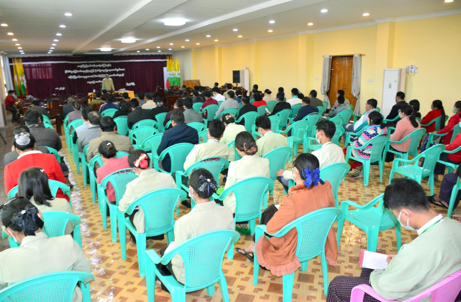 ရှေးဦးစွာ အစည်းအဝေးတွင် ခရိုင်အုပ်ချုပ်ရေးမှူး ဦးညီညီလွင်ကရုံးလုံခြုံရေး မိမိလုံခြုံရေးဂရုပြုကြရန်၊ မိုင်းသတိမိုင်းအသိ အထူးဂရုပြုကြရန်၊ ပွင့်လင်းရာသီရောက်ရှိလာပြီဖြစ်သဖြင့် မီးဘေးလုံခြုံရေးဂရုစိုက်ကြရန်၊ သဘာဝဘေးလျော့ပါးရေး စေတနာ့ဝန်ထမ်းလူငယ်(ဆင့်ပွား) သင်တန်းဖွင့်လှစ်ရာတွင် ပူးပေါင်းပါဝင်တက်ရောက်ကြရန်စသည်တို့ကို ဆွေးနွေးပြောကြားသည်။