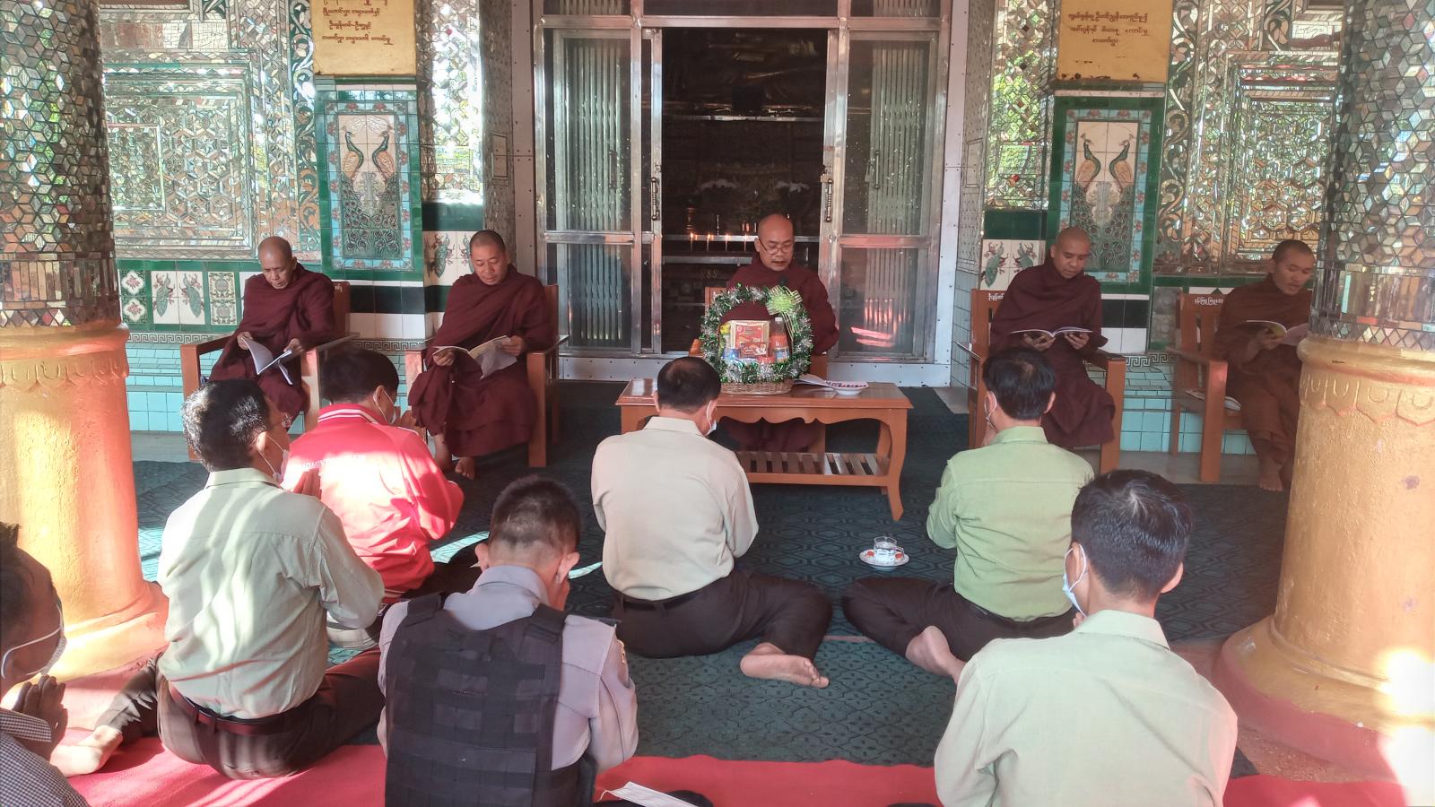 ဒေသနာတော်များ ရွတ်ဖတ်ပူဇော်ရာတွင် တောင်ပေါ်ကျောင်းတိုက်ဆရာတော် ဦးဆောင်သည့် သံဃာတော်များ ခရိုင်/မြိုနယ်အထွေထွေအုပ်ချုပ်ရေးဦးစီးဌာန ဝန်ထမ်းဝတ်ရွတ်အသင်းတို့မှ အတွင်းအောင်ခြင်းရှစ်ပါးပါဠိတော် အပြင်အောင်ခြင်းရှစ်ပါးပါဠိတော်နှင့် ဓဇဂ္ဂသုတ်တို့အားရွတ်ဖတ်ပူဇော်ပြီး မေတ္တာပို့အမျှအတန်းပေးဝေခဲ့ကြ သည်။