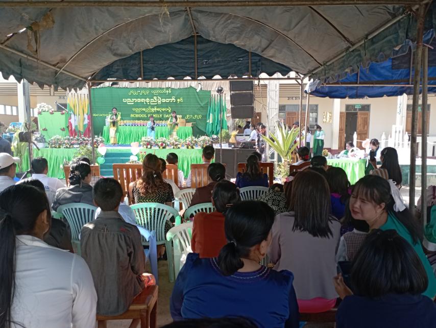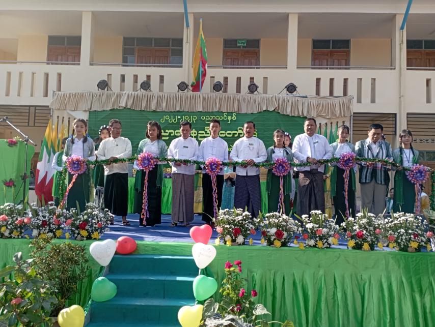 အခမ်းအနားကို စုံညီပွဲတော် ဒို့နွှဲပျော် သီးချင်းဖြင့် မြို့နယ်ပညာရေးမှူးဦးမြင့်ဦး၊ ကျောင်းအုပ်ဆရာကြီး ဦးမိုးမြင့်အောင်နှင့် တာဝန်ရှိသူများက ဖဲကြိုးဖြတ် ဖွင့်လှစ်ပေးသည်။
