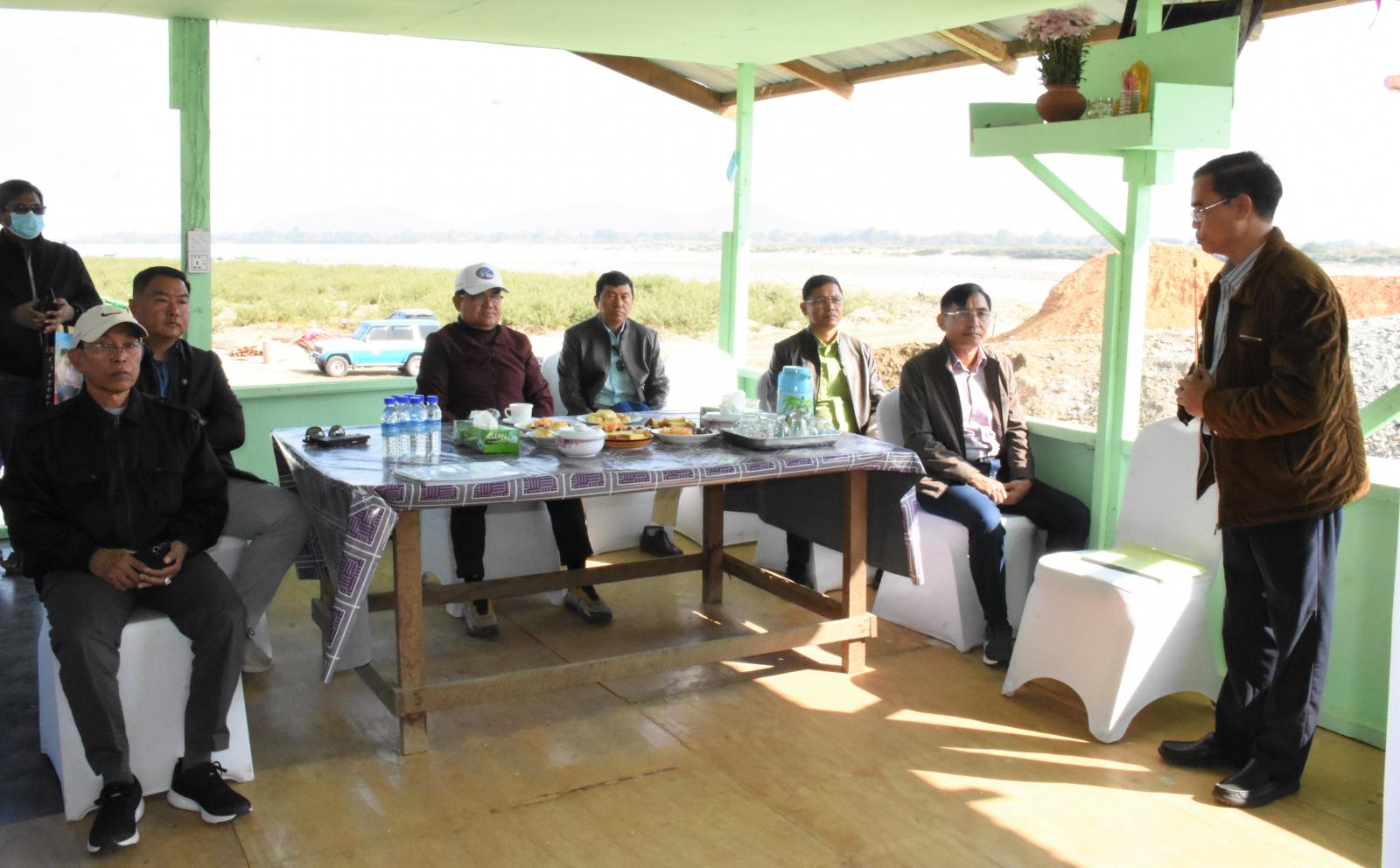 ထို့နောက် ပြည်နယ်ဝန်ကြီးချုပ်နှင့် အဖွဲ့သည် မြစ်ကြီးနားမြို့ ဧရာဝတီမြစ်ရေ တိုက်စားခြင်းမှ ကာကွယ်ရန်အတွက် ၂၀၂၂-၂၀၂၃ ဘဏ္ဍာရေးနှစ် ပြည်နယ်အစိုးရအဖွဲ့၏ ငွေလုံးငွေရင်း ရန်ပုံငွေဖြင့် လယ်ကုန်းရပ်ကွက်၊ နယ်မြေ (၉)နှင့် နယ်မြေ (၁၀) အတွင်း မြေထိန်းနံရံ တည်ဆောက်ခြင်းစီမံကိန်းလုပ်ငန်းခွင်ရှင်းလင်းဆောင်၌ ကျောက်စီမြေထိမ်းနံရံ စုစုပေါင်း အရှည်ပေ (၃၁၈၈) ပေကို အပိုင်း (၂)ပိုင်းဖြင့် ဆောင်ရွက်လျက်ရှိသည့် အခြေအနေများနှင့် စပ်လျဉ်း၍ ပြည်နယ်ဆည်မြောင်းနှင့် ရေအသုံးချမှုစီမံခန့်ခွဲရေးဦးစီးဌာန၊ ပြည်နယ် ဦးစီးမှူးနှင့် တာဝန်ရှိသူများ၏ ရှင်းလင်းတင်ပြမှုကို ပြည်နယ်ဝန်ကြီးချုပ် ဦးခက်ထိန်နန်က လုပ်ငန်းများ အရည်အသွေးပြည့်မီစွာဖြင့် အချိန်မီပြီးစီးအောင် ဆောင်ရွက်ရေး၊ ခိုင်ခံမှုရှိစေရေးနှင့် လိုအပ်သည်များကို ညှိနှိုင်းပေါင်းစပ်ဆောင်ရွက်ပေးခဲ့သည်။