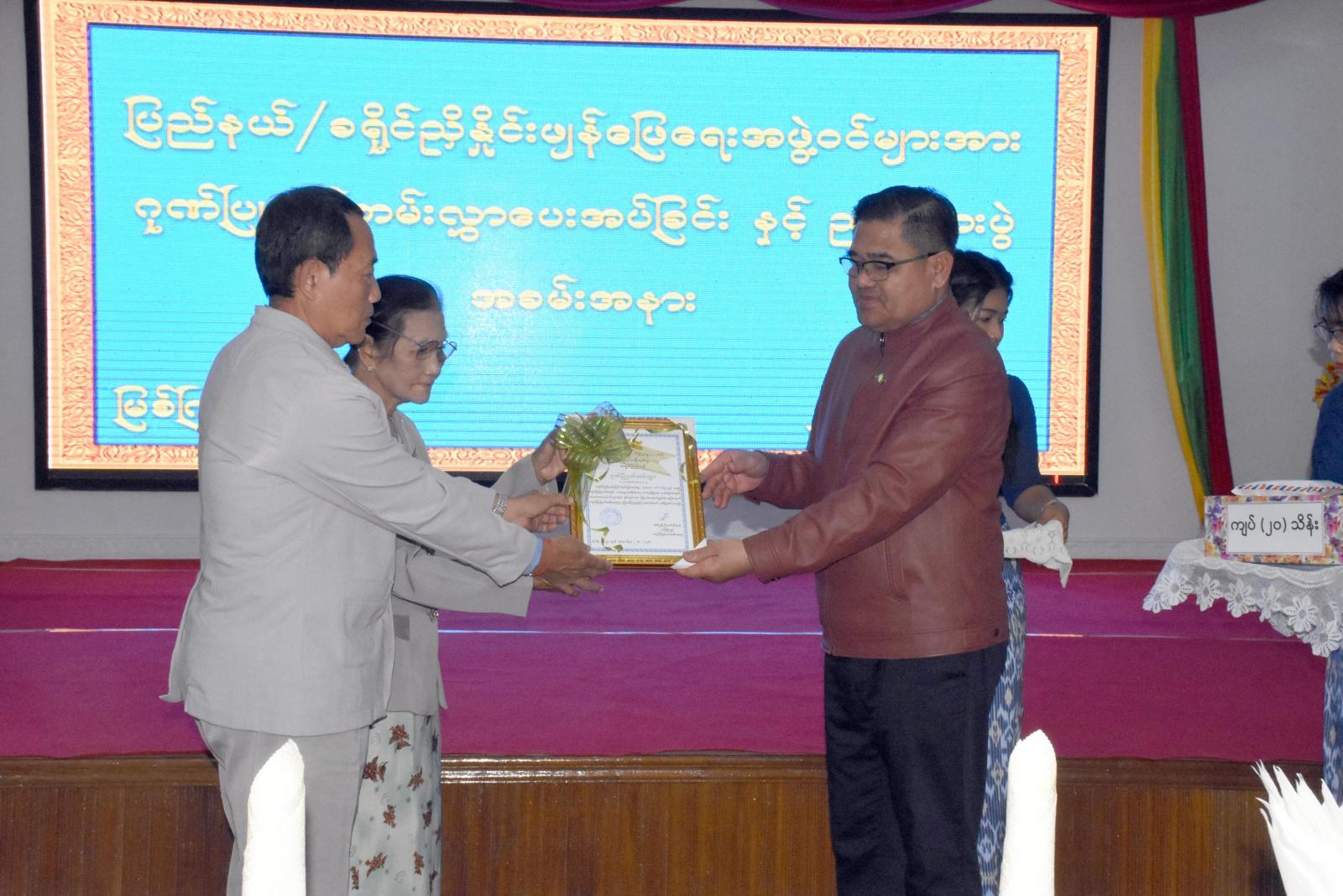 ထို့နောက် ပြည်နယ်ဝန်ကြီးချုပ်က ပြည်နယ်ညှိနှိုင်းဖျန်ဖြေရေးအဖွဲ့ နာယကအဖွဲ့ဝင်များထံ ဂုဏ်ပြု မှတ်တမ်းလွှာနှင့် ဂုဏ်ပြုချီးမြှင့်ငွေကျပ်သိန်း (၂၀)ကိုလည်းကောင်း၊ ပြည်နယ်ဝန်ကြီးများက မြစ်ကြီးနားခရိုင်၊ မိုးညှင်းခရိုင်နှင့် ဗန်းမော် ခရိုင် ညှိနှိုင်းဖျန်ဖြေရေးအဖွဲ့များမှ တာဝန်ရှိသူများထံ ဂုဏ်ပြုမှတ်တမ်းလွှာနှင့် ဂုဏ်ပြုချီးမြှင့်ငွေကျပ် (၁၀)သိန်းစီကို လည်းကောင်း ချီးမြှင့်ပေးအပ်ခဲ့ကြရာ ပြည်နယ်ညှိနှိုင်းဖျန်ဖြေရေးအဖွဲ့ဥက္ကဋ္ဌ ဦးဖော်လားဂမ်ဖန်က ကျေးဇူးတင်စကား ပြန်လည် ပြောကြားခဲ့ပြီး ဂုဏ်ပြုညစာကို အတူတကွသုံးဆောင်ခဲ့ကြကြောင်း သိရသည်။
