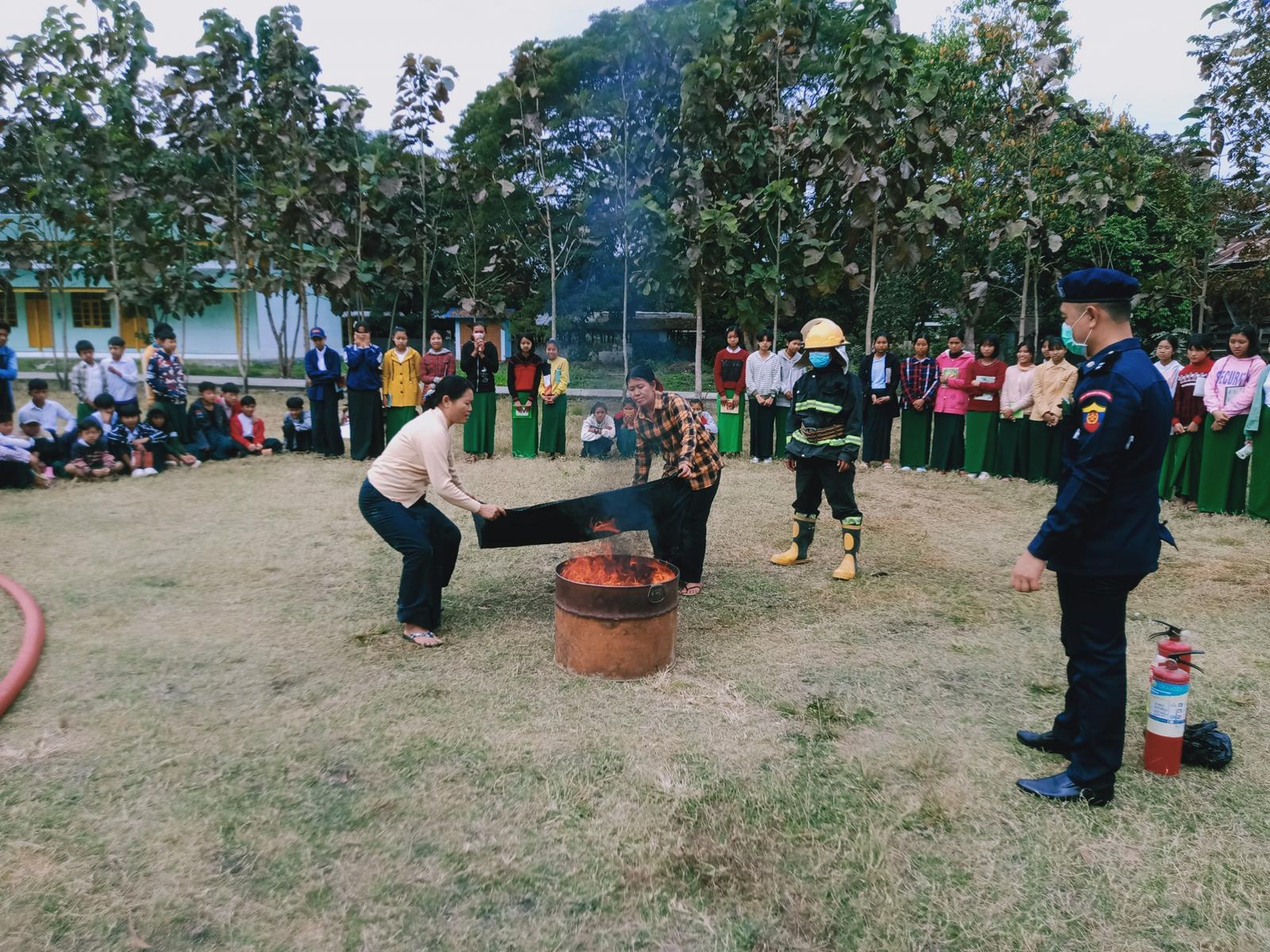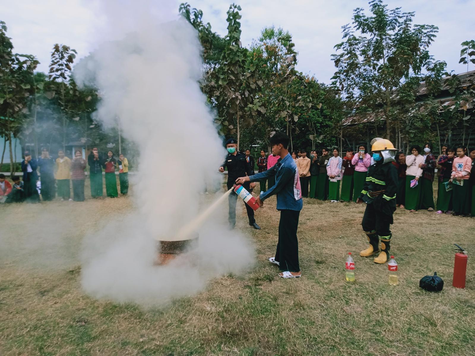 ထိုသို့ ဆောင်ရွက်ခဲ့ရာတွင် ဟိုပင်မြို့ နယ်မြေမီးသတ်စခန်းမှ ဒုတိယဦးစီးမှူးသိန်းကျော်က စာသင်ကျောင်းများတွင် ကြိုတင်ဆောင်ရွက်ထားရှိမည့် မီးဘေးအန္တရာယ် ကြိုတင်ကာကွယ်ရေး လုပ်ငန်းများနှင့် ပတ်သက်၍ ဆောင်ရန်၊ ရှောင်ရန်အချက်များ၊ မီးလောင်မှု အမျိုးအစားအလိုက် မီးငြှိမ်းသတ်ခြင်း နည်းစနစ်များကို ကျောင်းသား/သူများအား အသိပညာပေး ဟောပြောခဲ့ပြီး လက်တွေ့ သရုပ်ပြသခြင်းများ ဆောင်ရွက်ရာတွင် တာဝန်ရှိသူများက ကျောင်းသား/သူများအား မီးငြိမ်းစေရေးနည်းလမ်းများ၊ ရှာဖွေကယ်ဆယ်ရေးသုံး ပစ္စည်းများဖြင့် လက်တွေ့ အသုံးပြုပုံ ပြုနည်းများကို သရုပ်ပြ ဆောင်ရွက်ခဲ့ကြသည်။