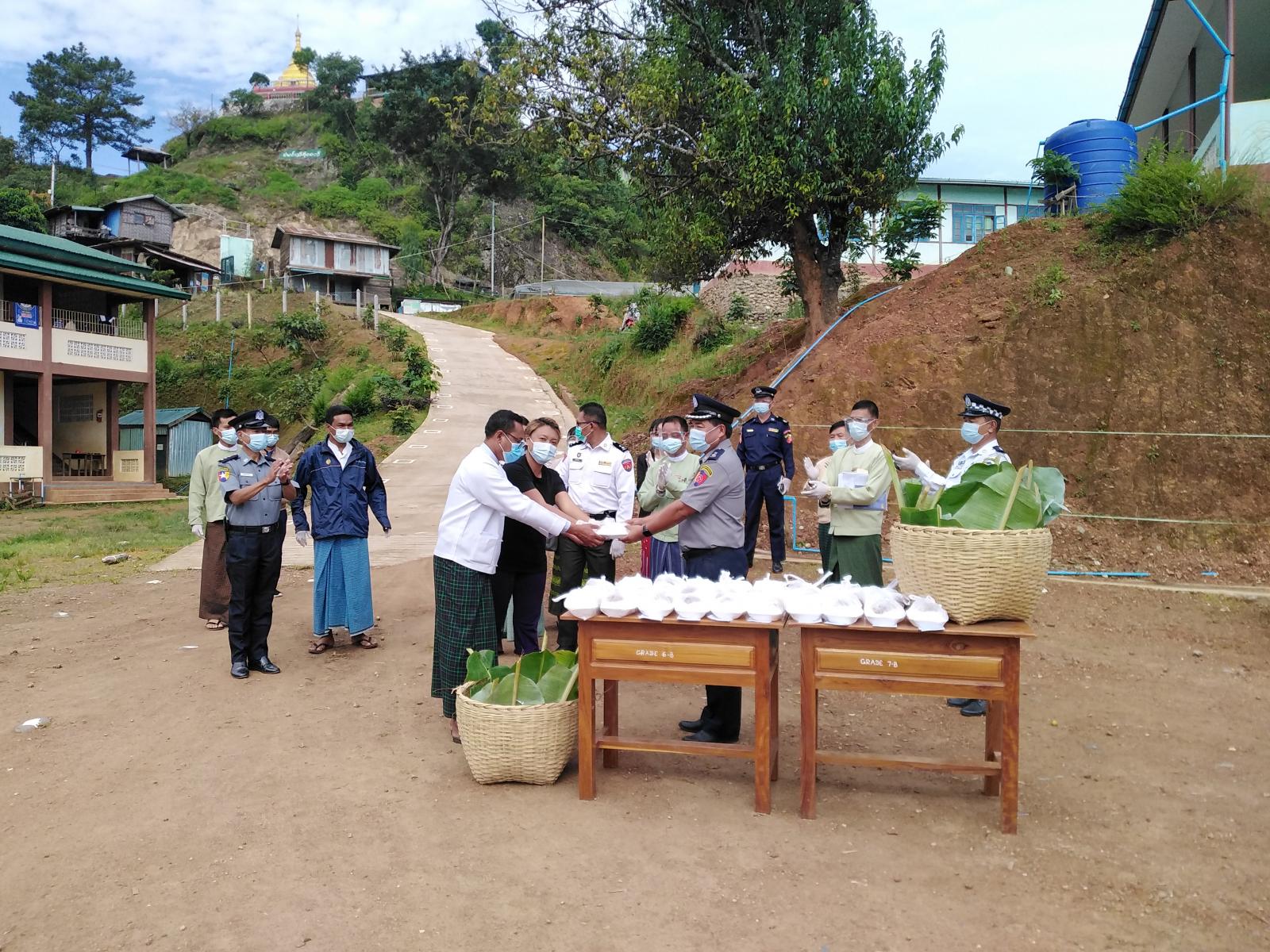 (၅၆) နှစ်မြောက် မြန်မာနိုင်ငံရဲတပ်ဖွဲ့နေ့အား ကြိုဆိုဂုဏ်ပြုသောအားဖြင့် Facility Quarantine ဝင်နေသူများအား ယနေ့နံနက် ၈ နာရီအချိန်က မင်းတပ်ခရိုင်ရဲတပ်ဖွဲ့မှ ရဲတပ်ဖွဲ့ဝင်များက ထမင်းဘူးများ လှူဒါန်းပေးခဲ့ကြောင်း သိရသည်။