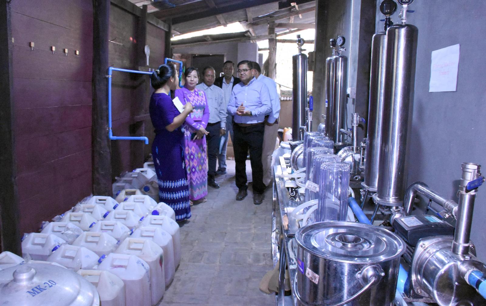 ထို့နောက် မွန်းလွဲပိုင်းတွင် ပြည်နယ်ဝန်ကြီးချုပ်နှင့် အဖွဲ့သည် ဗန်းမော်မြို့ (၂)မိုင်အောင်သာ ရပ်ကွက်အတွင်း နေအိမ်သုံး ကာလာသွပ်ပြားစက်ရုံ၌ သွပ်ပြားများ ထုတ်လုပ်နေမှုအခြေအနေကို လည်းကောင်း၊ အဆိုပါ ရပ်ကွက်အတွင်းရှိ Heaven ရေသန့်စက်ရုံ၌ ရေသန့်စက်ရုံလည်ပတ်ထုတ် လုပ်နေမှုနှင့် Apple ရေသန့်စက်ရုံ၌ ရေသန့်စက်လည်ပတ် ထုတ်လုပ် နေမှုများကို လည်ကောင်း လှည့်လည်ကြည့်ရှုစစ်ဆေးခဲ့ကြပြီး ထုတ်ကုန်များ တိုးမြှင့်ထုတ်လုပ်နိုင်ရေး၊ ဈေးကွက်ခိုင်မာ မှုရှိစေရေး လိုအပ်သည်များကို ဌာနဆိုင်ရာများနှင့် ပေါင်းစပ်ဆောင်ရွက်ပေးခဲ့သည်။