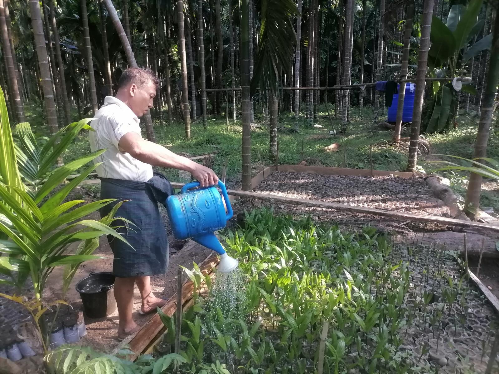 ဇန်နဝါရီ၊ ဖေဖော်ဝါရီလလောက်တွင် ကွမ်းသီးအရင့်အမှည့်ကို အပင်မှခူးချွေပြီး အလုံးငါးရာ တစ်အိတ်ထည့်ပြီး ရေထဲတွင်အခွံများရှုံ့တွလာသည်အထိ ရေစိမ်ပေးထားရသည်။ နှစ်ပတ်ခန့် အကြာရေထဲမှ ကွမ်းသီးများကိုဆယ်ယူပြီး အရိပ်ထဲတွင်ထား၍ တစ်လအကြာအစို့ အညှောက်လေးများ ထွက်လာသောအခါပျိုးအိတ်ထဲထည့်ပြီး ပျိုးထောင်ထားနိုင်သည်။တစ်ချို့က မြောင်း ဘောင်ပြုလုပ်၍ မြေကြီးပေါ်တွင်အမှည့်လုံးများကို ရေမှန်မှန်လောင်းပေးခြင်းဖြင့် ပျိုးထောင် စိုက်ပျိုးနိုင်သည်။ အပင်ရှင်သန်မှ၊ အောင်မြင်မှုမှာ ပျိုးအိတ်နှင့်ပျိုးထောင်စိုက်ပျိုးသောအပင်မှာ ပိုအောင်မြင်ဖြစ်ထွန်းသည်။