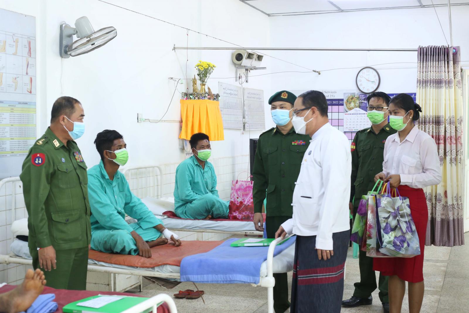 အမှတ်(၂) တပ်မတော်ဆေးရုံကုတင်(၁၀၀)သည် ကရင်ပြည်နယ်အတွင်းရှိ တပ်ရင်းတပ်ဖွဲ့များမှ တပ်မတော်သား မိသားစုဝင်များနှင့် တိုင်းရင်းသားပြည်သူများ၏ ကျန်းမာရေးစောင့်ရှောက်မှု လုပ်ငန်းများကို ဆောင်ရွက်ပေးလျက်ရှိသော ဆေးရုံတစ်ရုံဖြစ်ပြီး ပြည်နယ်ဝန်ကြီးချုပ်နှင့်အဖွဲ့သည် တပ်ရင်းတပ်ဖွဲ့များမှ တပ်မတော်သား၊ ရဲမေ၊ မိသားစုဝင်များနှင့် ပတ်ဝန်းကျင်ဒေသများမှ ဆေးရုံ တက်ရောက်ကုသမှုခံယူနေသူများအား တစ်ဦးချင်း၏ရောဂါဖြစ်ပွားမှု၊ ဆေးဝါးကုသပေးထားမှုနှင့် ကျန်းမာရေး တိုးတက်ကောင်းမွန်လာမှု အခြေအနေများကို ရင်းရင်းနှီးနှီး မေးမြန်းအားပေးစကား ပြောကြားကာ ဆေးရုံတက်ရောက်ကုသမှုခံယူနေသူ စုစုပေါင်း ၇၀ ဦးခန့်အား ကြက်ဥ၊ ဘီစကစ်၊ ကွေကာအုတ်၊ နွားနို့ဘူး၊ PEP နို့မုန့်၊ ခေါက်ဆွဲခြောက် အစရှိသော အာဟာရဖြည့်စွက် အစားအစာ များ ထောက်ပံ့ပေးအပ်ခဲ့သည်။