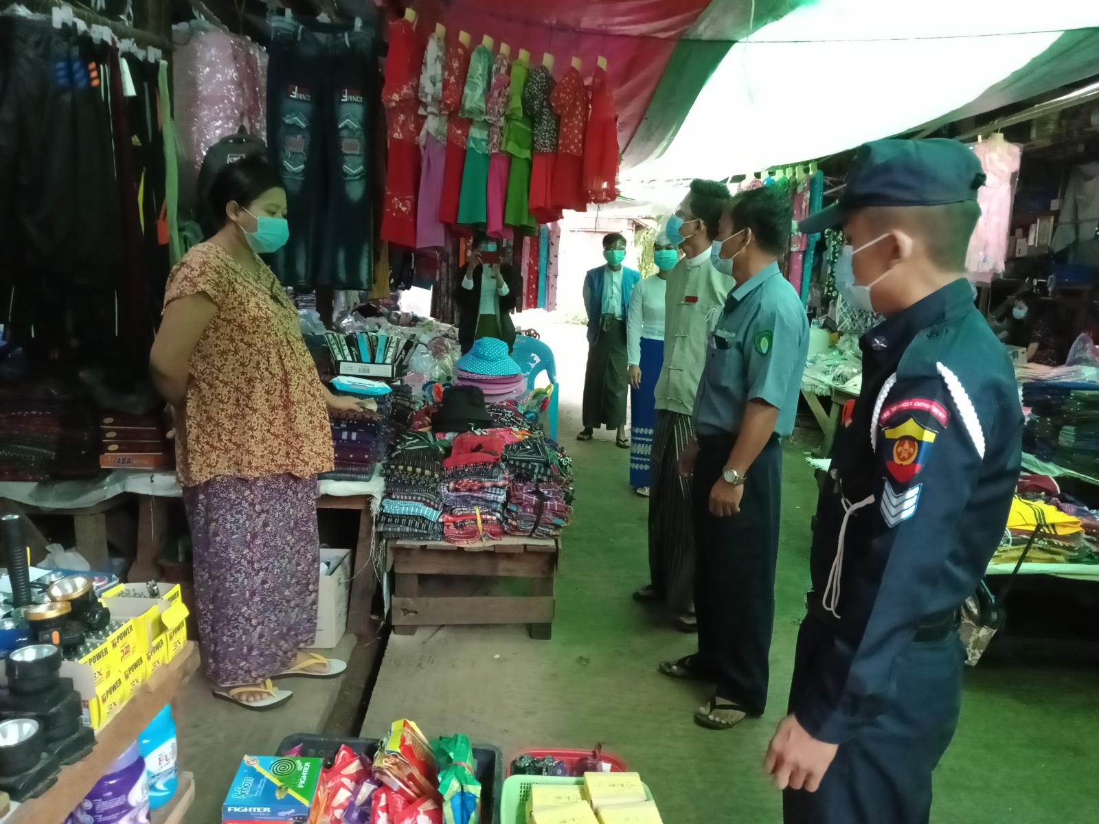 ကြည့်ရှုစစ်ဆေးရာတွင် စည်ပင်သာယာရေးအမှုဆောင်အရာရှိ ဦးသန်းထိုက်ဦး၊ မြို့နယ် ကျန်းမာရေးမှူး ဦးစိုးပိုင်၊လူမှုဝန်ထမ်းဦးစီးဌာန ဦးစီးအရာရှိ၊ သဘာဝဘေးဆိုင်ရာ စီမံ ခန့်ခွဲရေးဦးစီးဌာနမှ ဦးစီးအရာရှိ၊ မြို့နယ်အထွေထွေအုပ်ချုပ်ရေးဦးစီးဌာန တာဝန်ရှိသူများ၊ ရပ်ကွက် အုပ်ချုပ်ရေးမှူးနှင့် မီးသတ်တပ်ဖွဲ့မှ တာဝန်ရှိသူတို့ ပူးပေါင်းပြီး မြို့မဈေးတွင် ရောင်းချ နေသော ဈေးသည်များ mask တပ်ဆင်မှုရှိ/မရှိ ရောင်းချနေသော သားငါးများ၊ ကုန်ပစ္စည်းများ ကို ကိုဗစ်-၁၉ ကာလအတွင်း ဈေးနှုန်းတင်ရောင်းချမှုမရှိစေရေး၊ သားငါးမှတဆင့် ရောဂါ ကူးစက်နိုင်သည့်အတွက် နယ်ကျော်သားငါးများ မရောင်းချမိစေရေး အသိပညာပေး ရှင်းလင်းပြောကြားခဲ့ကြသည်။