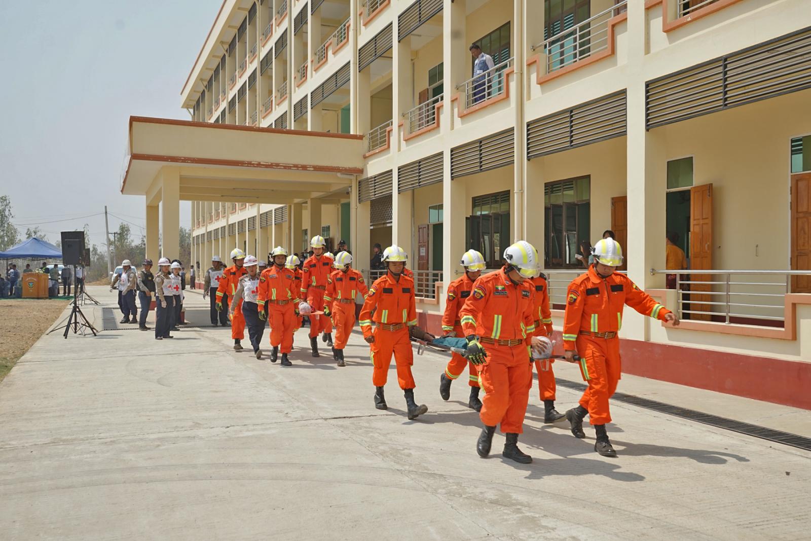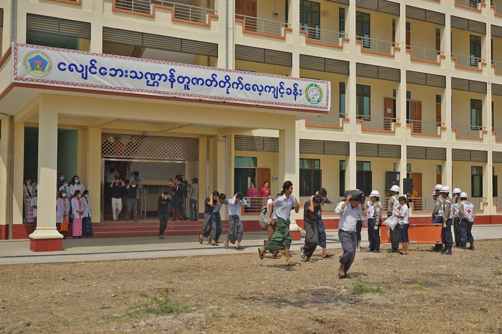 ထို့နောက် ငလျင်ဘေးသဏ္ဌာန်တူဇာတ်တိုက်လေ့ကျင့်ခြင်း ဆောင်ရွက်မှုအဖြစ် ငလျင် လှုပ်ခတ်ခြင်းအကြောင်း အချက်ပေးခြင်းနှင့်အတူ ကျောင်းသား/သူများမှ ဝပ်၊ ကာ၊ ကိုင်ပုံစံဖြင့် နေရာယူခြင်း၊ ငလျင်လှုပ်ခတ်မှုငြိမ်သက်ပါက အဆောင်အဦးနှင့်လွတ်ကင်းရာ ကွင်းပြင်နေရာများတွင် နေရာယူခြင်းတို့ကို သရုပ်ပြသခဲ့ပြီးနောက် ကယ်ဆယ်ရေးအဖွဲ့ဝင်များမှ ရှာဖွေကယ်ဆယ်ရေးလုပ်ငန်းများ သရုပ်ပြခြင်း၊ ကြက်ခြေနီတပ်ဖွဲ့ဝင်များမှ ရှေးဦးသူနာပြုစုခြင်းသရုပ်ပြသခြင်း၊ ကျန်းမာရေးစောင့်ရှောက်မှုအဖွဲ့များက ဆေးဝါးကုသမှုသရုပ်ပြသခြင်းနှင့် ပို့ဆောင်ဆက်သွယ်ရေး လုပ်ငန်းအဖွဲ့က ယာဉ်၊ ယန္တရားများဖြင့် ဘေးကင်းလုံခြုံသည့်နေရာများသို့ ပို့ဆောင်ပေးခြင်းစသည့် သရုပ်ပြသမှုများအား ဆောင်ရွက်ခဲ့ကြောင်း သိရသည်။
