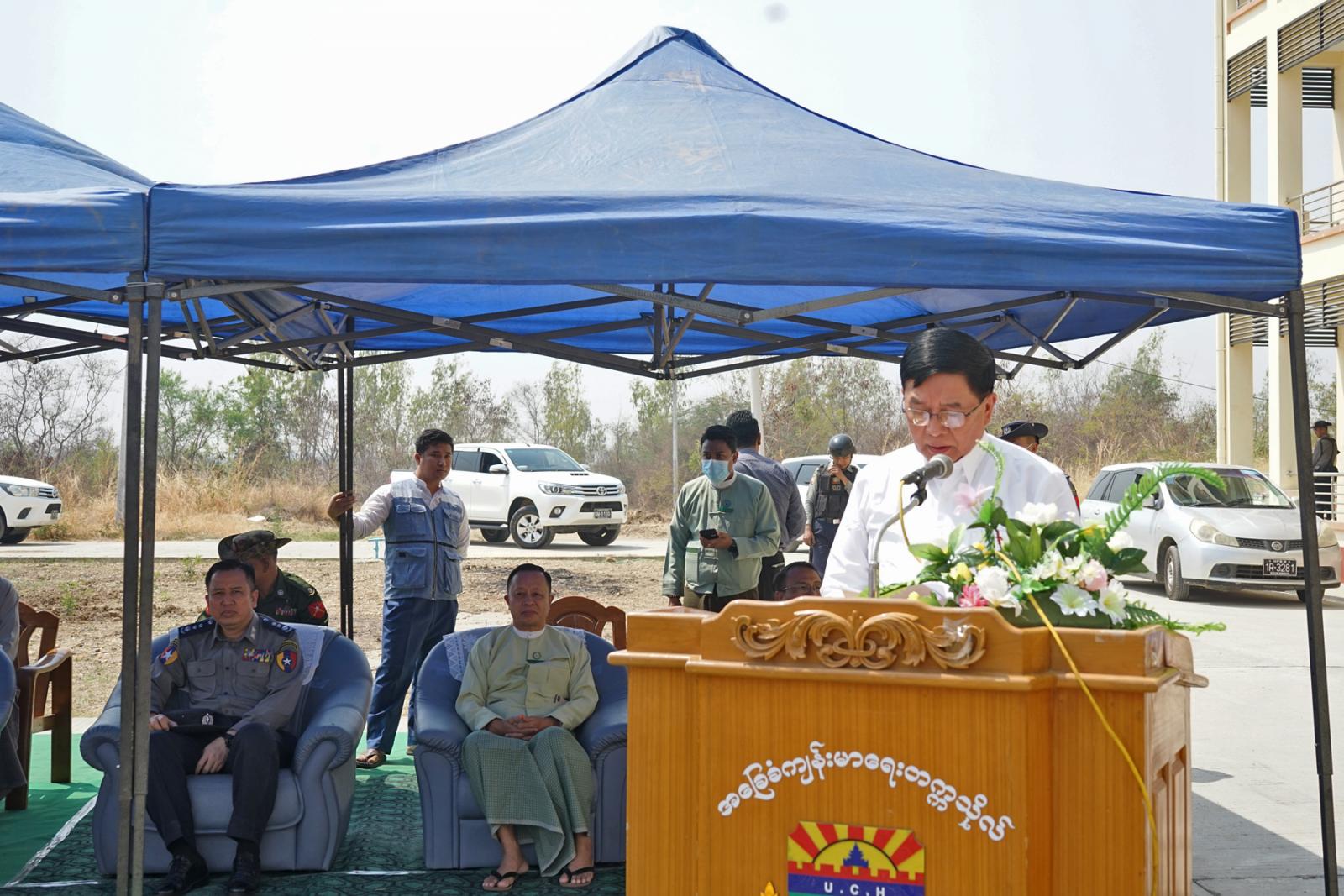 ရှေးဦးစွာ အခမ်းအနားတွင် တိုင်းဒေသကြီးအစိုးရအဖွဲ့ဝန်ကြီးချုပ်က အဖွင့်အမှာစကား ပြောကြားရာတွင် ယနေ့အချိန်တွင် ရာသီဥတုပြောင်းလဲမှုအကျိုးဆက်အဖြစ် သဘာဝဘေးအန္တရာယ် အမျိုးမျိုးကို ကမ္ဘာ့နိုင်ငံအသီးသီးက ခံစားနေရသည့်နည်းတူ မိမိတို့မြန်မာနိုင်ငံတွင်လည်း သဘာဝဘေးအန္တရာယ်များကို ပိုမိုခံစားလာရပါကြောင်း၊ သဘာဝဘေးအန္တရာယ်သည် တားဆီး၍ မရနိုင်သော်လည်း ကြိုတင်ကာကွယ်ခြင်းနှင့်ကြိုတင်ပြင်ဆင်ခြင်းများ ဆောင်ရွက်ပါက ထိခိုက်ဆုံးရှုံးမှုများ လျော့နည်းသက်သာမည်ဖြစ်ပြီး တစ်ဦးတစ်ယောက်၊ တစ်ဖွဲ့တည်းဖြင့်မဟုတ်ဘဲ အားလုံးဝိုင်းဝန်း ပူးပေါင်းဆောင်ရွက်မည်ဆိုပါက ပြည်သူလူထု၏အသက်အိုးအိမ်၊ စည်းစိမ်ကိုကာကွယ်စောင့်ရှောက်နိုင်မည်ဖြစ်ပါကြောင်း၊ သဘာဝဘေးအန္တရာယ်များတွင် ငလျင်ဘေးအန္တရာယ်သည် အဖျက်စွမ်းအားလွန်စွာကြီးမားပြီး ကြိုတင်ခန့်မှန်းနိုင်ခြင်းမရှိဘဲ အချိန်မရွေးဖြစ်ပွားနိုင်ကာ ပျက်စီးဆုံးရှုံးမှုကြီးမားကာ နောက်ဆက်တွဲဘေးများလည်းရှိသောကြောင့် အားလုံးဂရုပြုပြီး ကြိုတင်ပြင်ဆင်ရမည့်ဖြစ်သည့်အပြင် သဘာဝဘေးလျော့ပါးရေးအတွက် ကြိုတင်ကာကွယ်ခြင်းဆောင်ရွက်ရာတွင် ပြည်သူလူထုထံသို့ အသိပညာပေးဆောင်ရွက်ခြင်းမှာ အလွန်အရေးကြီးပြီး ပြည်သူလူထုအနေဖြင့်ဆောင်ရန်၊ ရှောင်ရန်အချက်များကို သိရှိကာ ကြိုတင်ပြင်ဆင်မှုများဆောင်ရွက်ပါက ဆုံးရှုံးမှုများလျော့နည်းမည်ဖြစ်ပါကြောင်း၊ ယခုလို လက်တွေ့ပူးပေါင်းလေ့ကျင့်ခြင်းဖြင့် ဘေးအန္တရာယ်ရင်ဆိုင်ကြုံတွေ့ရပါက မိမိတို့ကဏ္ဍအလိုက် ဆောင်ရွက်ရမည့်လုပ်ငန်းစဉ်များကိုသိရှိပြီး ပိုမိုထိရောက်အောင် ဆောင်ရွက်နိုင်မည်ဖြစ်ပါကြောင်းနှင့် ဇာတ်တိုက်လေ့ကျင့်မှုတွင် ပါဝင်ဆောင်ရွက်မည့် ကျောင်းသား/သူများသည်လည်း ကျန်းမာရေးဝန်ထမ်းများအဖြစ် နေရာဒေသအသီးသီးတွင် တာဝန်ထမ်းဆောင်ကြမည်ဖြစ်ကာ မိမိတို့တာဝန်ကျရာဒေသများရှိ ပြည်သူလူထုများအား သဘာဝဘေးအန္တရာယ်ဆိုင်ရာ အသိပညာများအား ဆက်လက်ဖြန့်ဝေနိုင်မည်ဖြစ်ကြောင်းပြောကြားသည်။