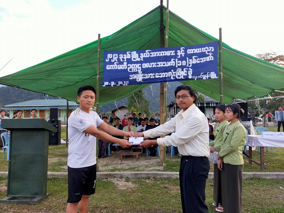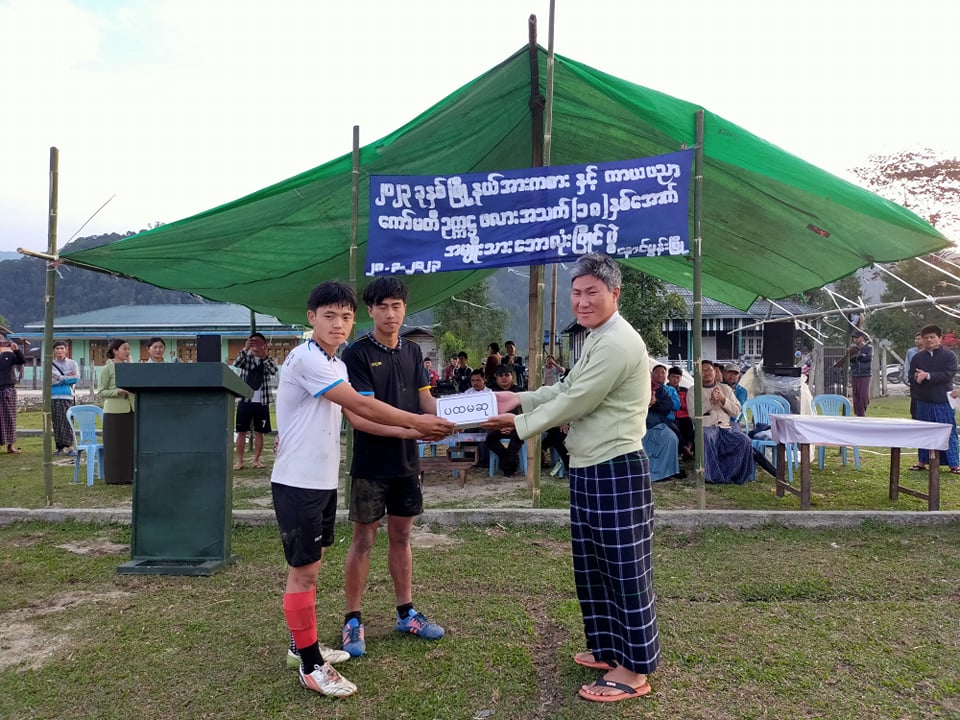 ဆက်လက်၍ ဆုပေးပွဲအခမ်းအနားကို ကျင်းပခဲ့ရာ အဖွင့်အမှာစကားကို မြို့နယ် အားကစားနှင့်ကာယပညာကော်မတီဥက္ကဋ္ဌ ဦးနမ်ရဲမင်က ပြိုင်ပွဲတွင် အားကြိုးမာန်တက် ကြိုးစားပါဝင် ကစားပေးခဲ့ကြသည့် ကစားသမားများ အသင်းသားများအားလုံးကို ကျေးဇူးတင်ရှိပါကြောင်း၊ မြို့နယ် အားကစားကဏ္ဍ ဖွံ့ဖြိုးတိုးတက်လာစေရေးအတွက် ဘောလုံးနည်းစနစ်အပိုင်း စည်းမျဉ်းစည်းကမ်းအပိုင်း ကိုယ်ကာယကျန်းမာကြံ့ခိုင်မှုအပိုင်းများကို ဆက်လက်လေ့လာ သင်ယူသွားကြရမှာဖြစ်ကြောင်းနှင့် ယခုပြိုင်ပွဲမှ မြို့နယ်ကိုယ်စားပြု လက်ရွေးစင်အသင်းတွင် ရွေးချယ်ခံရသည့် အားကစားသမားများအနေဖြင့် ပြည်နယ်တွင်းပြိုင်ပွဲများတွင် မြို့နယ်ဂုဏ်ဆောင်နိုင်စေရန် ကြိုးစားကစားသွားကြပါရန် တိုက်တွန်း မှာကြားသည်။