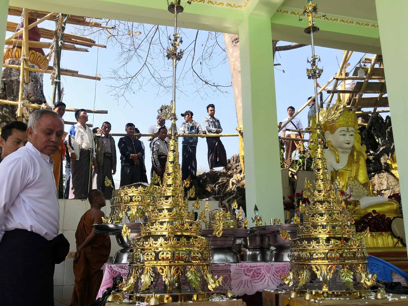 အဆိုပါ ထီးတော်တင်ပွဲတွင် မူဆယ်မြို့ ယာဉ်စည်းကမ်း ထိန်းသိမ်းရေးကော်မတီဥက္ကဋ္ဌ အလှူ့ရှင်ဒါယကာဦးစိုးမြင့်နှင့် အလှူရှင်ဒါယကာမ ဇနီးဒေါ်နန်းအေသိန်း မိသားစုတို့က ဦးဆောင်၍ ထီးတော်တင်လှူပူဇော်ခဲ့သည်။ ထို့နောက် ထီးတော်ပူဇော်ရာတွင် နောင်ဟင်ကျေးရွာ ကျောင်းဆရာတော် ဦးဆောင်၍ ကျေးရွာမှ ရပ်မိရပ်ဖများ၊ ဂေါပကလူကြီးများ စုံညီလက်ဆင့်ကမ်း၍ ဘုရားထီးတော်တင်ပူဇော်ခဲ့သည်။