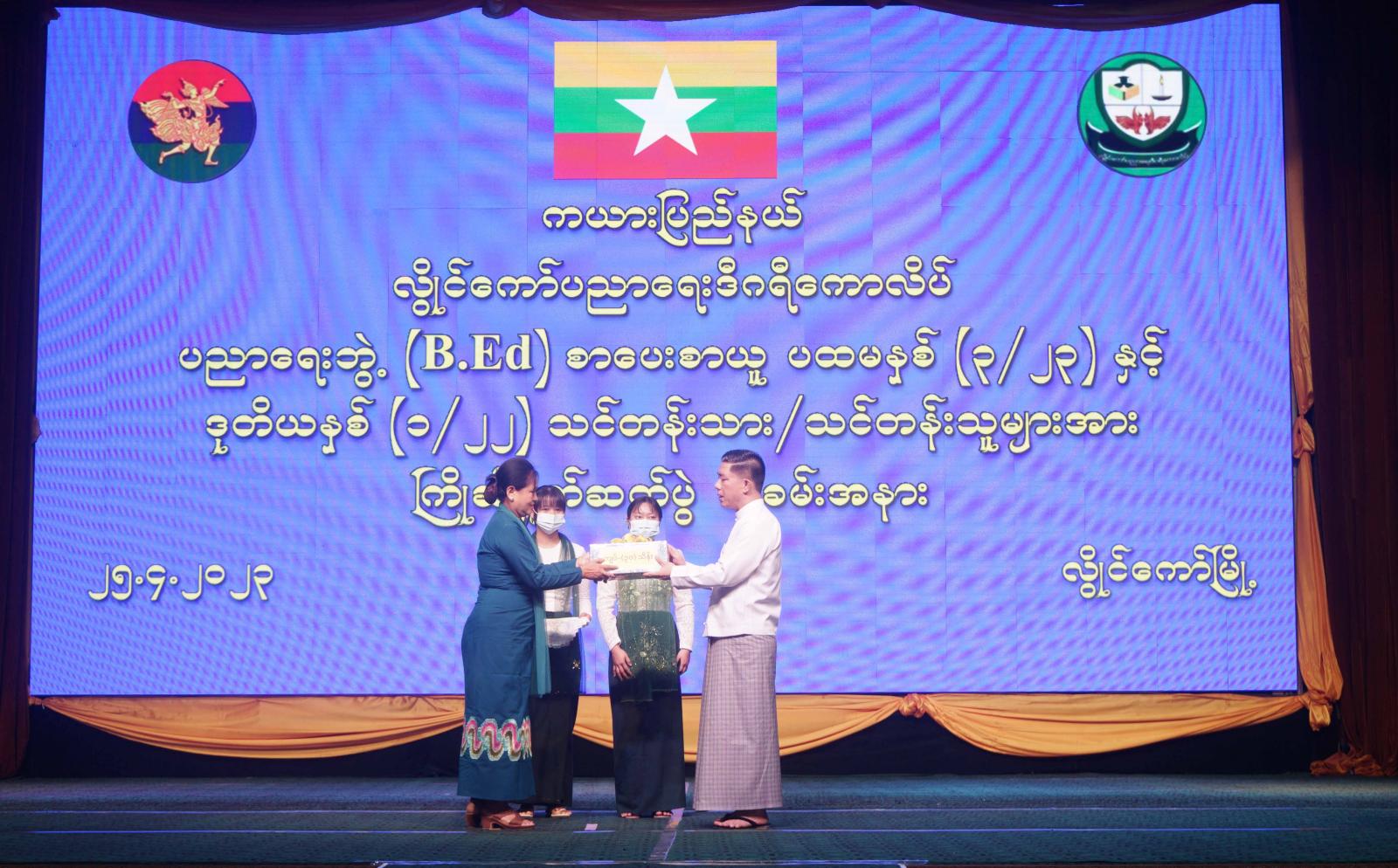 ထို့နောက် ပြည်နယ်ဝန်ကြီးချုပ်က သင်တန်းသား၊ သင်တန်းသူဆရာ၊ ဆရာမများအတွက် ထောက်ပံ့ငွေများကိုပေးအပ်ခဲ့ရာ လွိုင်ကော်ပညာရေးဒီဂရီကောလိပ် ကျောင်းအုပ်ကြီးဒေါ်ချယ်ရီထွန်းက လက်ခံရယူခဲ့ပြီး ပြည်နယ်ဝန်ကြီးချုပ်နှင့် ပြည်နယ်အစိုးရအဖွဲ့ဝင်များ၊ ကျောင်းအုပ်ကြီးနှင့်သင်တန်းသား၊ သင်တန်းသူများက စုပေါင်းမှတ်တမ်းတင် ဓါတ်ပုံရိုက်ကူးခဲ့ကြသည်။