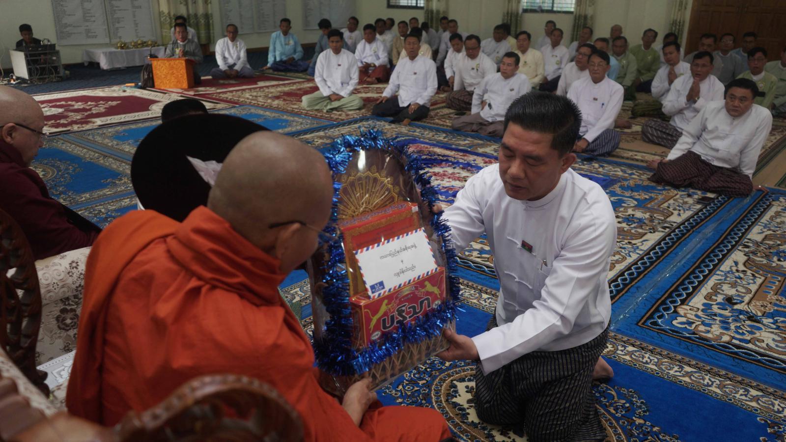 ဆက်လက်ပြီး ဆရာတော်၊ သံဃာတော်အရှင်သူမြတ်များ ရွတ်ဆိုတော်မူသော ပရိတ်တရားတော်များ နာယူကြည်ညိုကြပြီး ပြည်နယ်ဝန်ကြီးချုပ်နှင့် တာဝန်ရှိသူများက ဆရာတော်၊ သံဃာတော်များအား လှူဖွယ်ဝတ္ထုပစ္စည်းများ ဆက်ကပ်လှူဒါန်းခဲ့ကြသည်။