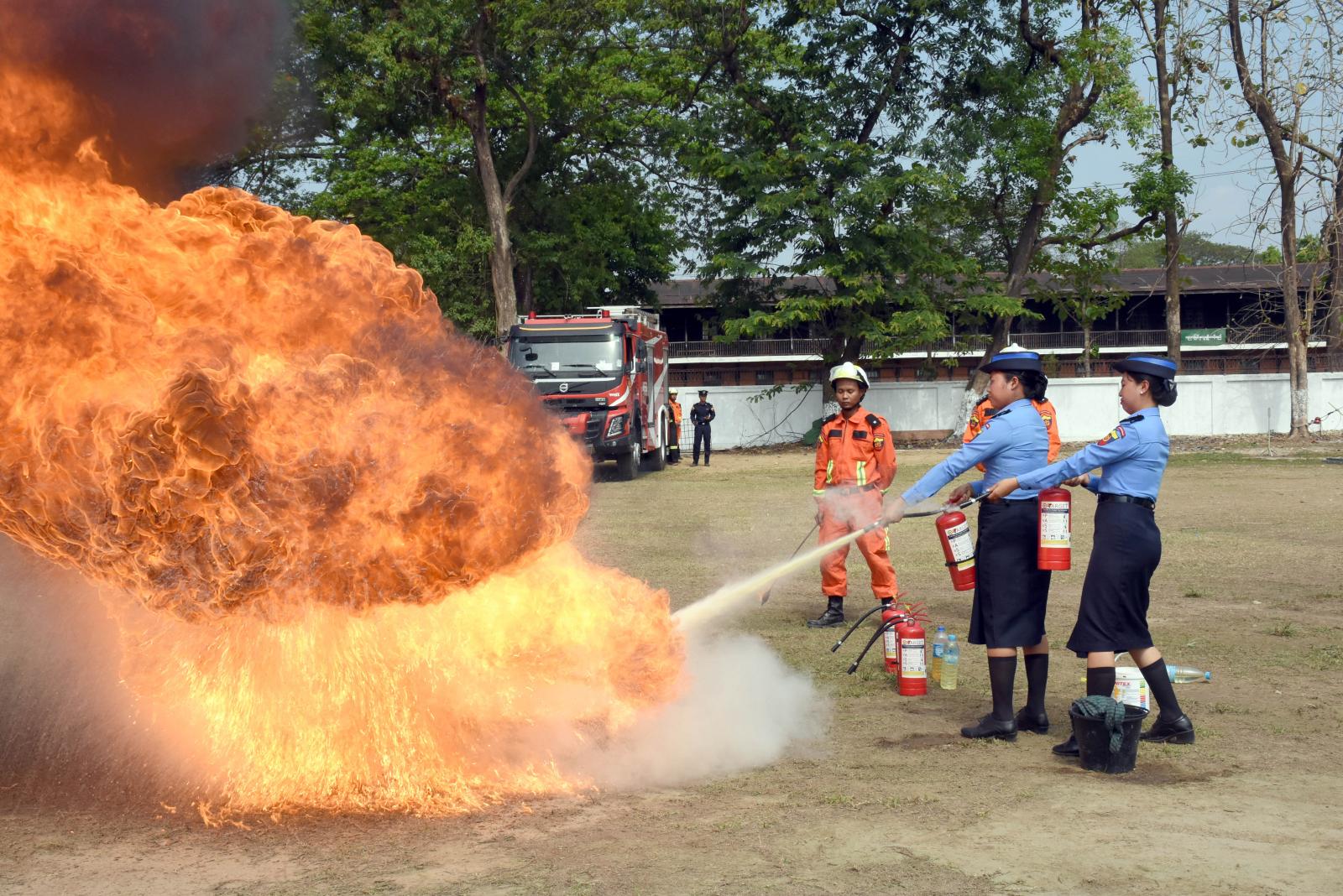 ယင်းနောက် ကျောင်းအားကစားကွင်းအတွင်း မီးသတ်တပ်ဖွဲ့ဝင်များ၊ မီးသတ်ယာဉ်များနှင့် ရှာဖွေ ကယ်ဆယ်ရေးယာဉ်တန်းများက အလေးပြုချီတက်ကြခြင်း၊ ကွင်းအတွင်း GAS မီးလောင်မှု၊ ဆီမီးလောင်မှု၊ ဆီဘောက်ဆာမီးလောင်မှုများ၊ LUF Micro မီးသတ်ယာဉ်၊ Fire Fighting Operation For Tank Fire ၊ ကျေးလက်မီးငြှိမ်းခြင်းသတ်နည်း၊ ငလျင်ဘေးအန္တရာယ်ရှာဖွေကယ်ဆယ်ရေးနှင့် မီးသတ်ယာဉ်များမှ Water Colour ဖြင့် မီးငြှိမ်းသတ်ခြင်းနှင့် ရှာဖွေကယ်ဆယ်ရေး သရုပ်ပြခြင်းများ ကို ကြည့်ရှုအားပေးခဲ့ကြသည်။