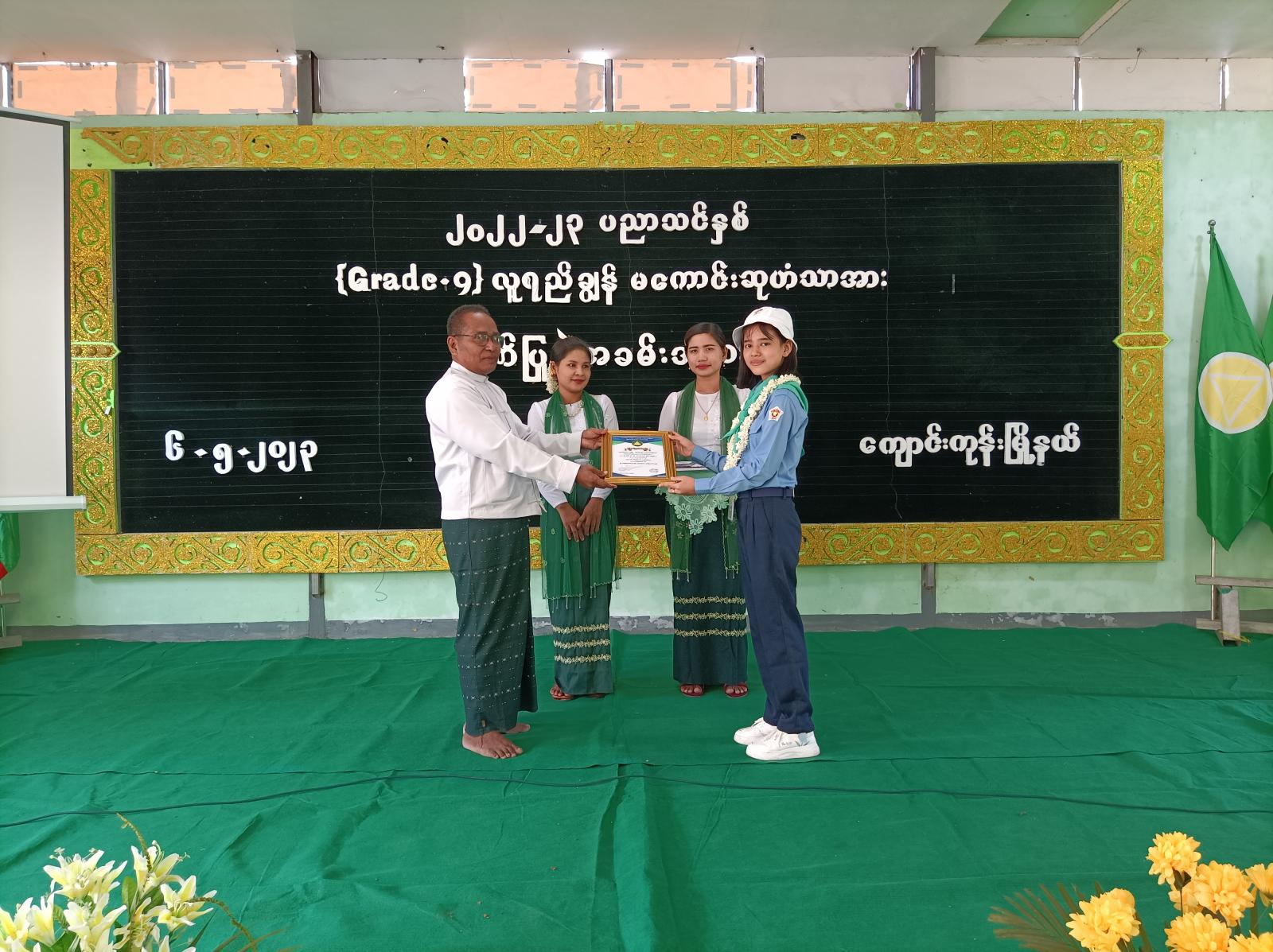 ထို့နောက် မြို့နယ်စီမံအုပ်ချုပ်ရေးအဖွဲ့ဥက္ကဋ္ဌမြို့နယ်အုပ်ချုပ်ရေးမှူး ဦးစိုးဝင်းနှင့် မြို့နယ်ပညာရေးမှူး ဦးအောင်ကျော်မြင့်တို့က ဂုဏ်ပြုမှတ်တမ်းလွှာ ချီးမြှင့်ခဲ့ပြီး အဖွဲ့ဝင်(၂)ဦးတင်မောင်နှင့် မြို့နယ်မိခင်နှင့်ကလေးစောင့် ရှောက်ရေးအသင်းဥက္ကဋ္ဌ ဒေါ်ယဉ်ယဉ်မြင့်တို့ကလည်းကောင်း၊ အခြေခံပညာအထက်တန်း၊ အလယ်တန်း၊ မူလတန်းကျောင်းများမှလည်းကောင်း၊ မြတ်ပညာတံခွန်နှင့် ဘဝရှေ့ဆောင်ကိုယ်ပိုင်ကျောင်းများမှလည်းကောင်း၊ (ရာသက်ပန်)ငွေပဒေသာပင်မှလည်းကောင်း ဂုဏ်ပြုဆုငွေ စုစုပေါင်းငွေကျပ်(၁၃)သိန်းကျော် ချီးမြှင့်ခဲ့ကြောင်း သိရသည်။