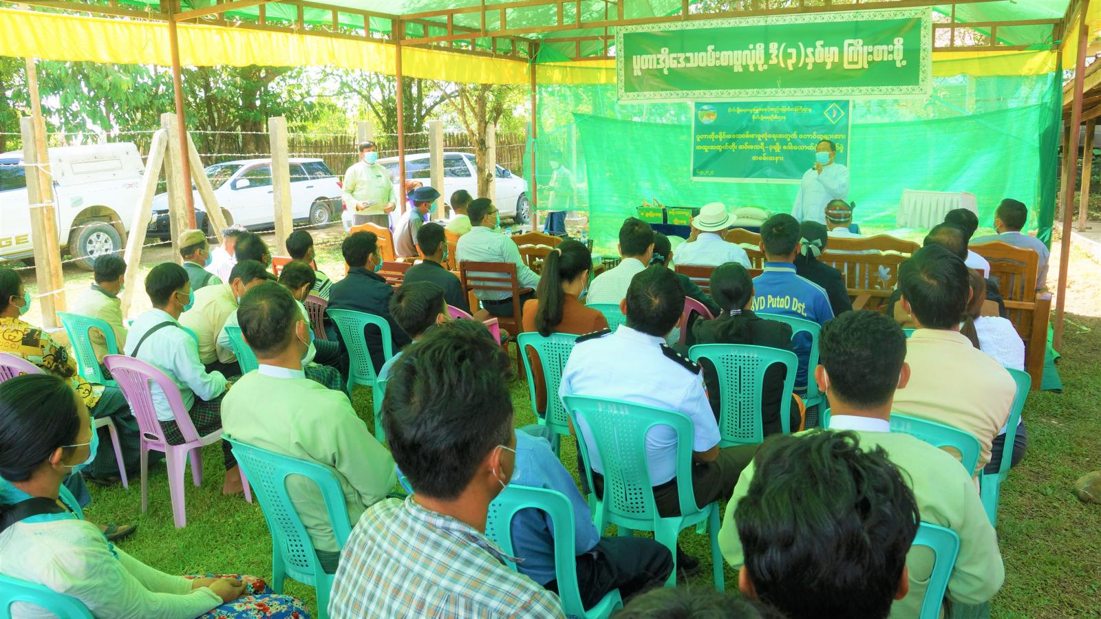 အခမ်းအနားတွင် ကချင်ပြည်နယ်အစိုးရအဖွဲ့ကိုယ်စား ပြည်နယ်သယံဇာတရေးရာဝန်ကြီး ဦးတိန့်ဆောင်က ပူတာအိုခရိုင် ဝမ်းစာဖူလုံရေးသည် စာရင်းဇယားများအရ (၄၅)ရာခိုင်နှုန်းသာရှိနေ ပါကြောင်း၊ သို့ဖြစ်ပါ၍ ပြည်နယ်အစိုးရအဖွဲ့အနေဖြင့် (၃)နှစ်အတွင်း ဒေသဝမ်းစာဖူလုံရေးအတွက် စီမံချက်များရေးဆွဲဆောင်ရွက်လျက်ရှိသည့်အပြင် စိုက်ပျိုးရေးသွင်းအားစုများ၊ မျိုးကောင်းမျိုးသန့် နှင့်နည်းပညာလိုအပ်ချက်များကို ပံ့ပိုးကူညီဆောင်ရွက်ပေးလျက်ရှိကြောင်း၊ ယနေ့ တက်ရောက်လာ ကြသည့် တောင်သူများအနေဖြင့် မိမိတို့ဒေသဝမ်းစာဖူလုံရေးအပြင် မိသားစုဝင်ငွေတိုးပွားစေရေး ဆန်စပါး၊ ဆီထွက်သီးနှံများအပါအဝင် စိုက်ပျိုးရေးထုတ်ကုန်များတိုးမြှင့်ထုတ်လုပ်နိုင်ရေး ဝိုင်းဝန်း ပူးပေါင်းကြိုးစားဆောင်ရွက်သွားကြရေး တိုက်တွန်းပြောကြားသည်။