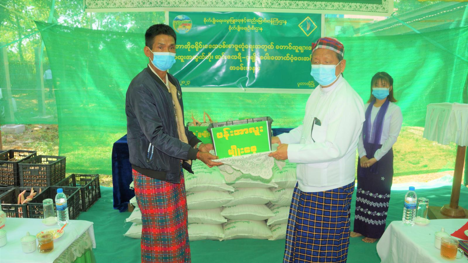 ထို့နောက် ပြည်နယ်တရားလွှတ်တော်သူကြီးချုပ် ဦးတူးဂျာ၊ ပြည်နယ်သယံဇာတရေးရာ ဝန်ကြီးဦးတိန့်ဆောင်နှင့် ပြည်နယ်ဥပဒေချုပ် ဒေါ်နန်းလှလှအေးတို့က ခရိုင်အတွင်းရှိ မြို့နယ်များမှ ဒေသခံတောင်သူများအတွက် မျိုးပြောင်းလဲစိုက်ပျိုးနိုင်ရေး အထူးအထွက်တိုးဆင်းဧကရီ - ၃မျိုးစပါး တင်း ၅၀၀၀၀၊ ငွေကျပ် (၁၀၅)သိန်း တန်ဖိုးရှိ ပန်းအာလူးမျိုးစေ့များနှင့် ဝဥမျိုးစေ့များကို အသီးသီး ထောက်ပံ့ပေးအပ်ကြရာ တောင်သူများက လက်ခံရယူခဲ့ကြသည်။