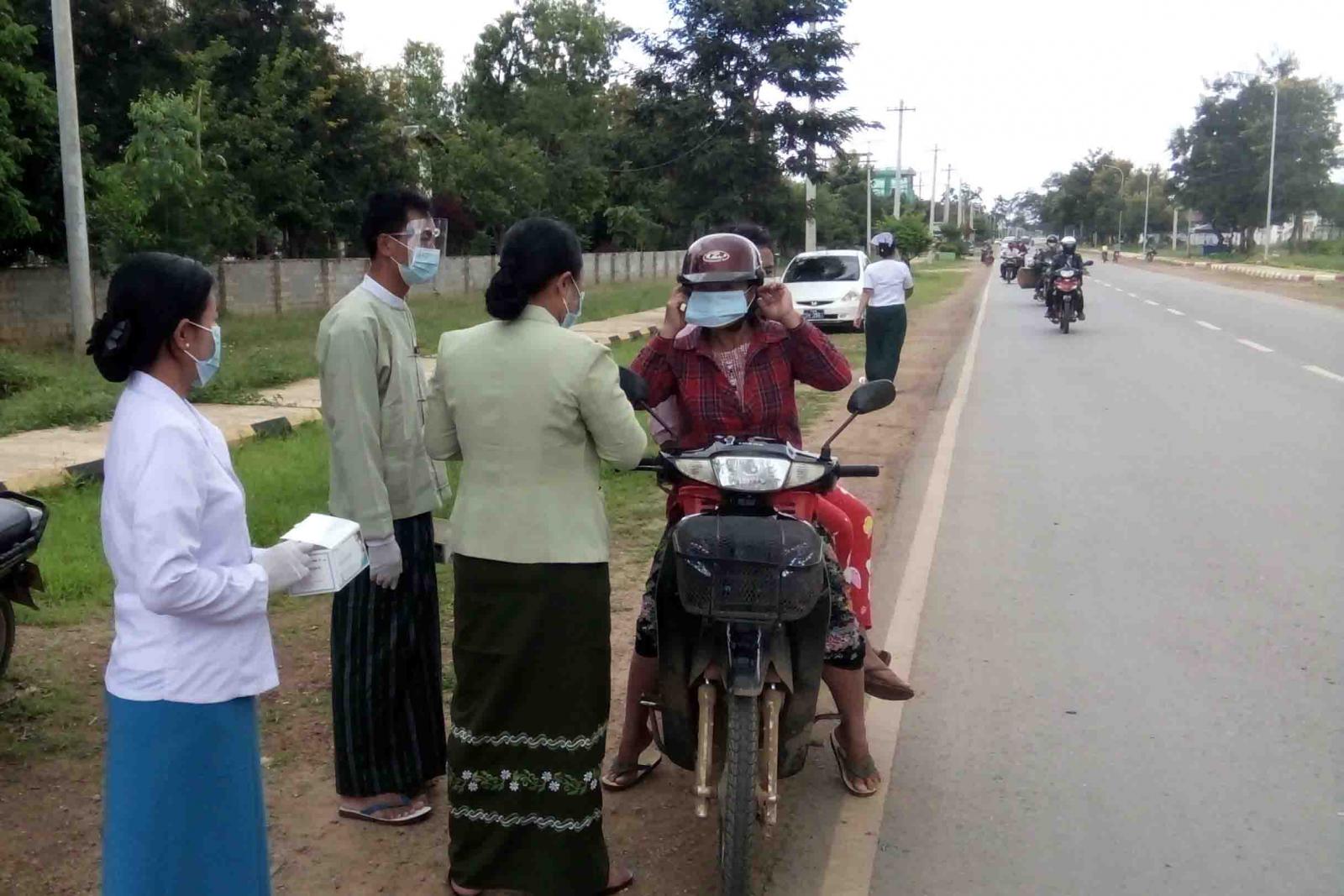 ထိုသို့ဆောင်ရွက်ရာတွင် မြို့နယ်အထွေထွေအုပ်ချုပ်ရေးဦးစီးဌာန၊ မြို့နယ်အဆင့်ဌာနဆိုင်ရာ တာဝန်ရှိသူများ၊ မြို့နယ်ရဲတပ်ဖွဲ့၊ မြို့နယ်မီးသတ်တပ်ဖွဲ့ နှင့် စေတနာ့ ဝန်ထမ်းများ ပါဝင်သည့် ပူးပေါင်းအဖွဲ့က ပြင်ပသို့ ထွက်ခွာ သွားလာနေကြသော ပြည်သူများအား ကျန်းမာရေး ညွှန်ကြားချက်များ နှင့် အညီ လိုက်နာဆောင်ရွက်ခြင်း ရှိ/မရှိ စစ်ဆေးဆောင်ရွက်ခဲ့ပြီး Mask တပ်ဆင်ခြင်းမရှိဘဲ သွားလာနေသည့် လမ်းသွား ၊ လမ်းလာ ပြည်သူများအား ကိုဗစ်-၁၉ ရောဂါ ကူးစက်ပြန့်ပွားမှု မဖြစ်ပေါ်စေရေးအတွက် အိမ်အပြင်ထွက်ပါက ကျန်းမာရေးညွှန်ကြားချက်များ နှင့်အညီ မဖြစ်မနေ Mask တပ်ဆင် သွားလာကြရန် အသိပေးပြောကြားကာ Mask နှစ်ခုကို ငွေကျပ်(၁၀၀ဝိ/-)ဖြင့် ချက်ချင်းဝယ်ယူ တပ်ဆင်စေ ခဲ့ကြောင်းသိရှိရသည်။