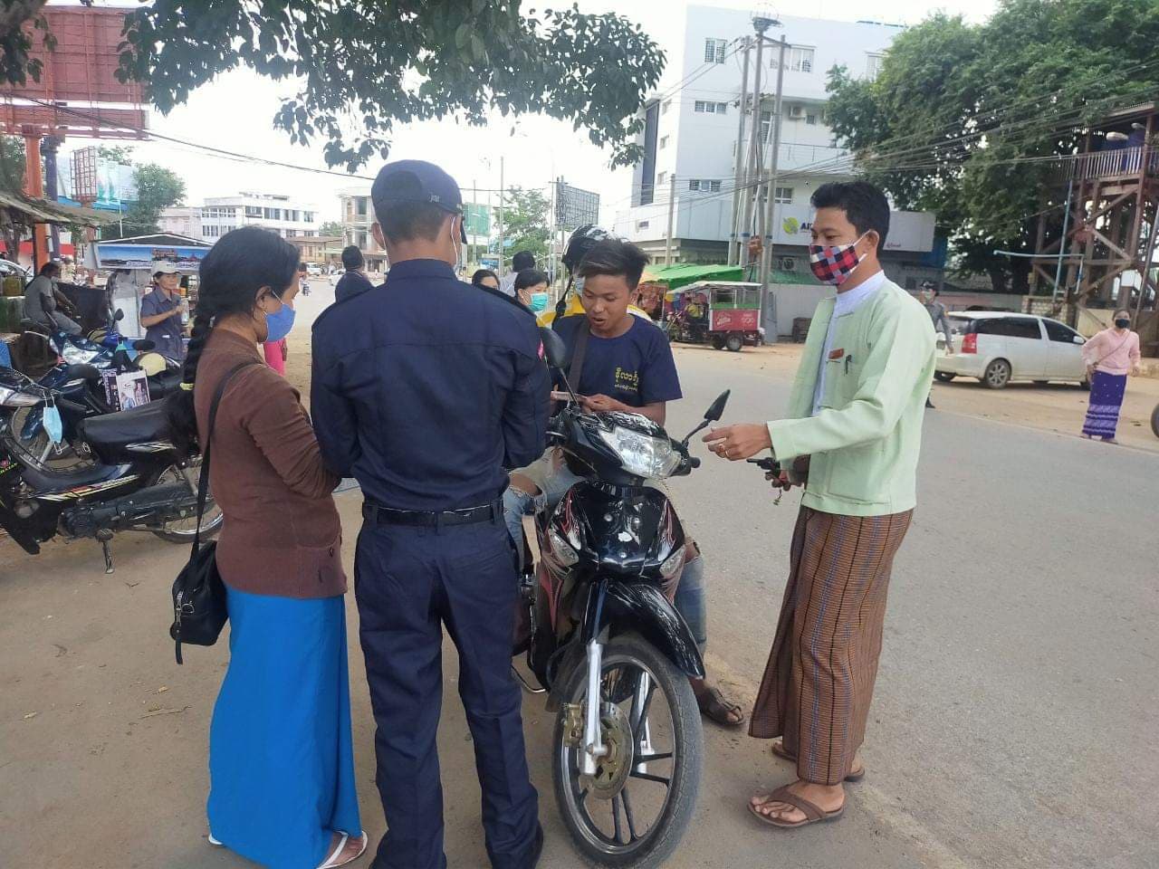 ထိုသို့ဆောင်ရွက်ရာတွင် မြို့နယ်အထွေထွေအုပ်ချုပ်ရေးဦးစီးဌာန၊ မြို့နယ်အဆင့်ဌာန ဆိုင်ရာ တာဝန်ရှိသူများ၊ မြို့နယ်မီးသတ်တပ်ဖွဲ့၊ မြို့နယ်ရဲတပ်ဖွဲ့၊ ယာဉ်ထိန်းရဲတပ်ဖွဲ့၊ စေတနာ့ဝန်ထမ်းများနှင့် လူမှုရေးအသင်းအဖွဲ့များ ပူးပေါင်းပါဝင်သည့်အဖွဲ့သည် မဖြစ်မနေ Mask တပ်ဆင်ရေးလှုပ်ရှားမှုအနေဖြင့် သီရိမင်္ဂလာဈေး(တောင်ဈေး)ရှေ့ လမ်းဆုံတွင် သွားလာနေကြသော ပြည်သူများအား ကျန်းမာရေး ညွှန်ကြားချက်များနှင့်အညီ လိုက်နာ ဆောင်ရွက်ခြင်း ရှိ/မရှိ စစ်ဆေးဆောင်ရွက်ခဲ့ပြီး Mask တပ်ဆင် ခြင်းမရှိဘဲ သွားလာနေသည့် လမ်းသွား၊ လမ်းလာ ပြည်သူများအား ကိုဗစ်-၁၉ ရောဂါ ကူးစက် ပြန့်ပွားမှုမဖြစ်ပေါ်စေရေးအတွက် အိမ်အပြင်ထွက်ပါက ကျန်းမာရေးညွှန်ကြားချက် များနှင့်အညီ မဖြစ် မနေ Mask တပ်ဆင်သွားလာကြရန် အသိပေးပြောကြားကာ Mask နှစ်ခုကို ငွေကျပ်(၁၀၀ဝိ/-)ဖြင့် ချက်ချင်းဝယ်ယူ တပ်ဆင်စေခဲ့ကြောင်း သိရှိရသည်။