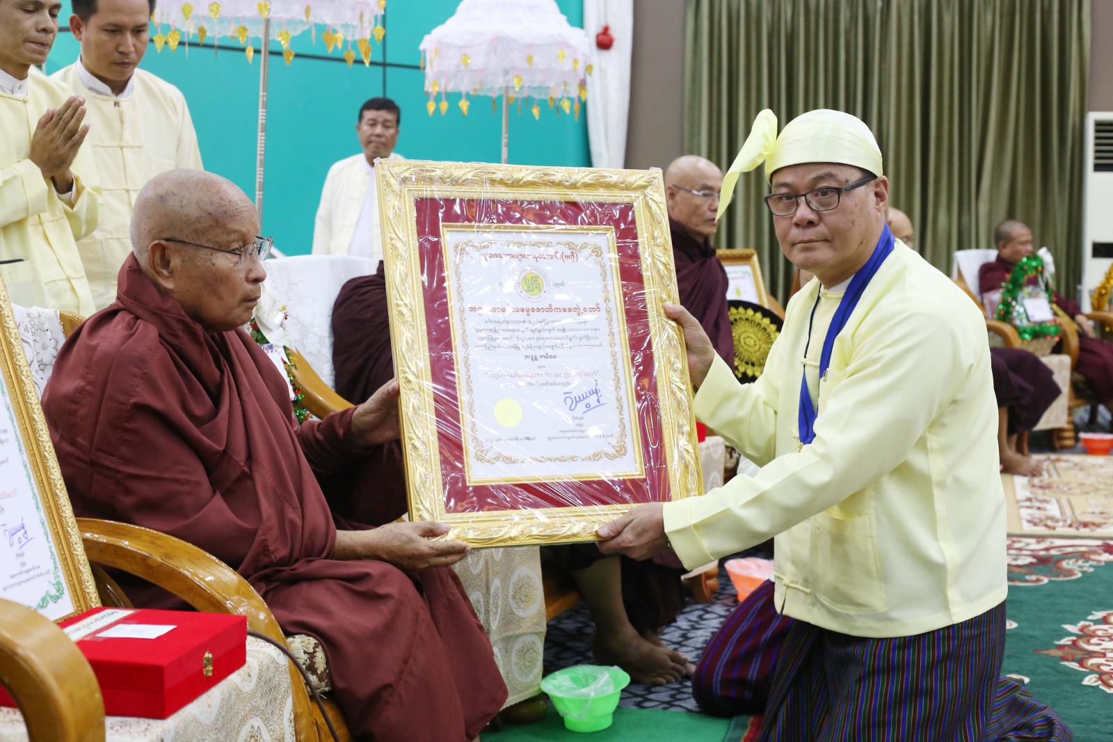 ထို့နောက် ပြည်နယ်ဝန်ကြီးချုပ်က အဂ္ဂမဟာမင်္ဂလဓမ္မဇောတိကဓဇဘွဲ့တော်ရရှိသော ဇွဲကပင်တောင် ဆရာတော်အားလည်းကောင်း၊ အရှေ့တောင်တိုင်းစစ်ဌာနချုပ်တိုင်းမှူးက မဟာမင်္ဂလဓမ္မဇောတိကဓဇဘွဲ့ရရှိသော ကမော့လဲကျောင်းတိုက်ဆရာတော် ဘဒ္ဒန္တဝေပုလ္လအားလည်းကောင်း၊ ဗုဒ္ဓဘာသာကလျာဏယုဝအသင်း(YMBA)(ဗဟို) နာယကဦးစိန်သန်းက မဟာမင်္ဂလဓမ္မဇောတိကဓဇဘွဲ့ရရှိသော အတုလမာရ်အောင်ကြာအင်းကျောင်းတိုက်ဆရာတော် ဘဒ္ဒန္တသောဘိတအားလည်းကောင်း၊ အရှေ့တောင်တိုင်းစစ်ဌာနချုပ်ဒုတိယတိုင်းမှူးက မဟာမင်္ဂလဓမ္မဇောတိကဓဇ ဘွဲ့ရရှိသော ဝဲကင်းအံကျောင်းတိုက်ဆရာတော်သဒ္ဓမ္မဇောတိကဓဇဘဒ္ဒန္တသုန္ဒရအားလည်းကောင်း၊ ပြည်နယ်လုံခြုံရေးနှင့်နယ်စပ်ရေးရာဝန်ကြီးက မဟာမင်္ဂလဓမ္မဇောတိကဓဇဘွဲ့ရရှိသော ကမမောင်းမြို့၊ ရွှေမြတ်မျိုးကြွယ်ကျောင်း တိုက်အုပ်ဆရာတော်ဘဒ္ဒန္တသီရိဓမ္မအားလည်းကောင်း၊ ပြည်နယ်သယံဇာတရေးရာဝန်ကြီးက မဟာမင်္ဂလဓမ္မဇောတိ ကဓဇဘွဲ့ရရှိသော မြဝတီမြို့နယ် ညောင်နန်းသာကျောင်းတိုက်ဆရာတော်ဘဒ္ဒန္တသောဘိတအားလည်းကောင်း ဘွဲ့တံဆိပ်တော်များ ဆက်ကပ်လှူဒါန်းခဲ့ကြပြီး ဗုဒ္ဓဘာသာကလျာဏယုဝအသင်း(YMBA)(ဗဟို)နာယကဦးစိန်သန်း က မဟာမင်္ဂလဓမ္မမဏိဇောတဓရ ဘွဲ့တံဆိပ်တော်ရရှိသော လူပုဂ္ဂိုလ်(၃)ဦးကိုလည်းကောင်း၊ ကရင်ပြည်နယ်ဝန်ကြီးချုပ်က မင်္ဂလဓမ္မမဏိဇောတဓရ ဘွဲ့တံဆိပ်ရ ဘားအံမြို့နေ ဒေါ်မြတင်နှင့် ဦးကြည်ရွှင်ထွန်းတို့အားလည်းကောင်း ဘွဲ့တံဆိပ်များ ပေးအပ်ချီးမြှင့်သည်။