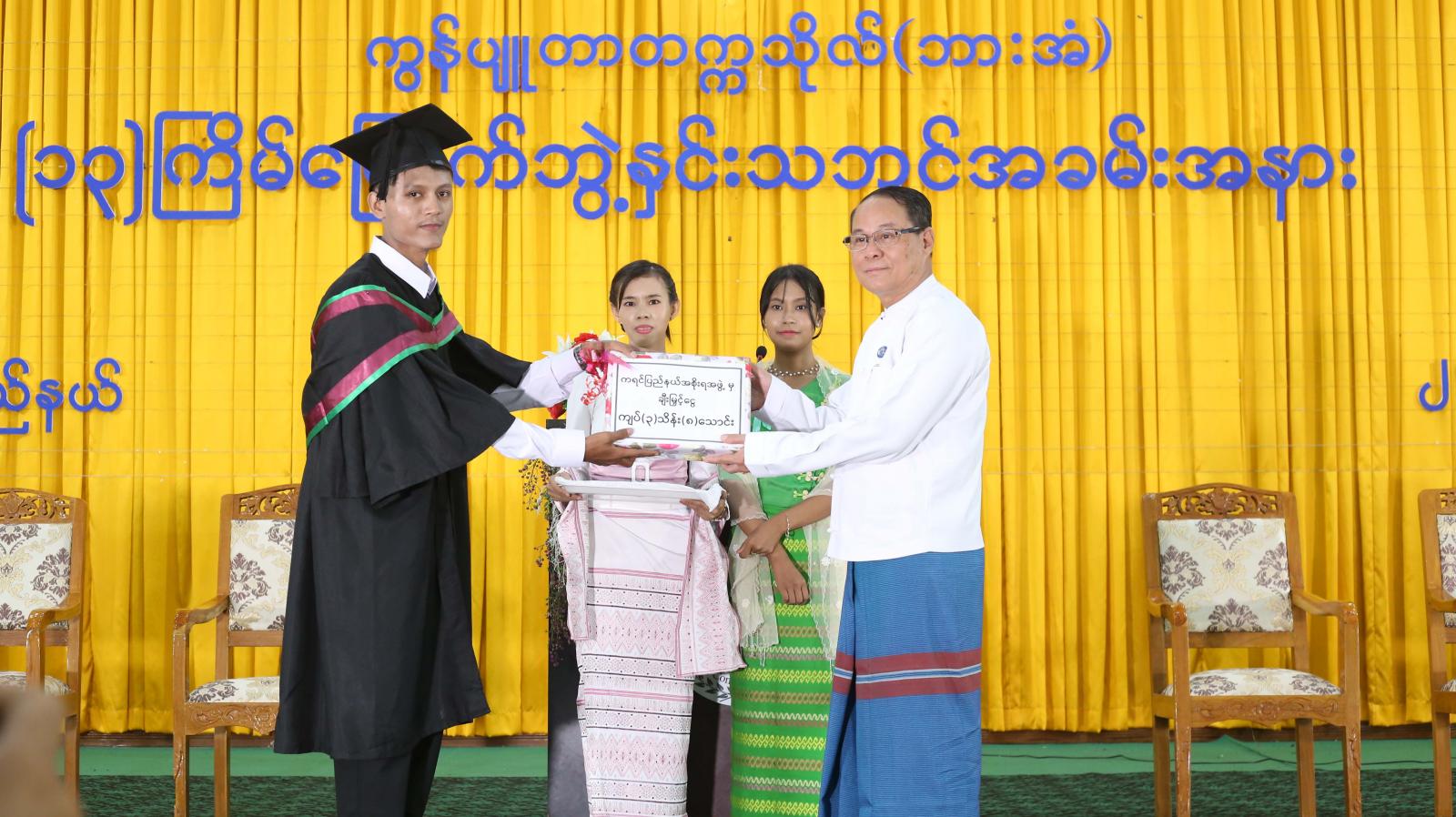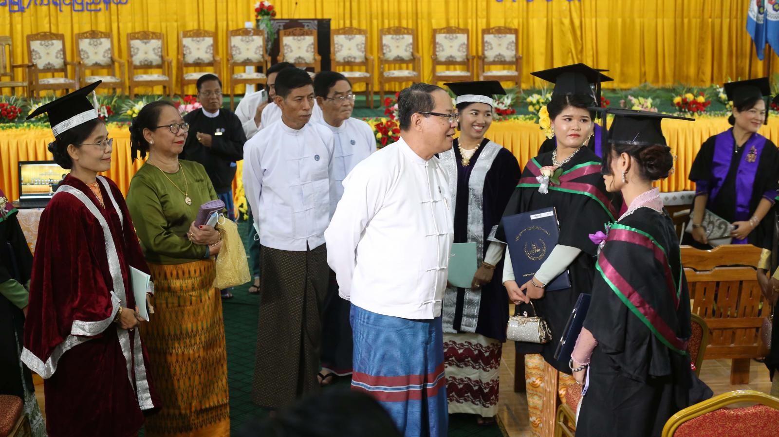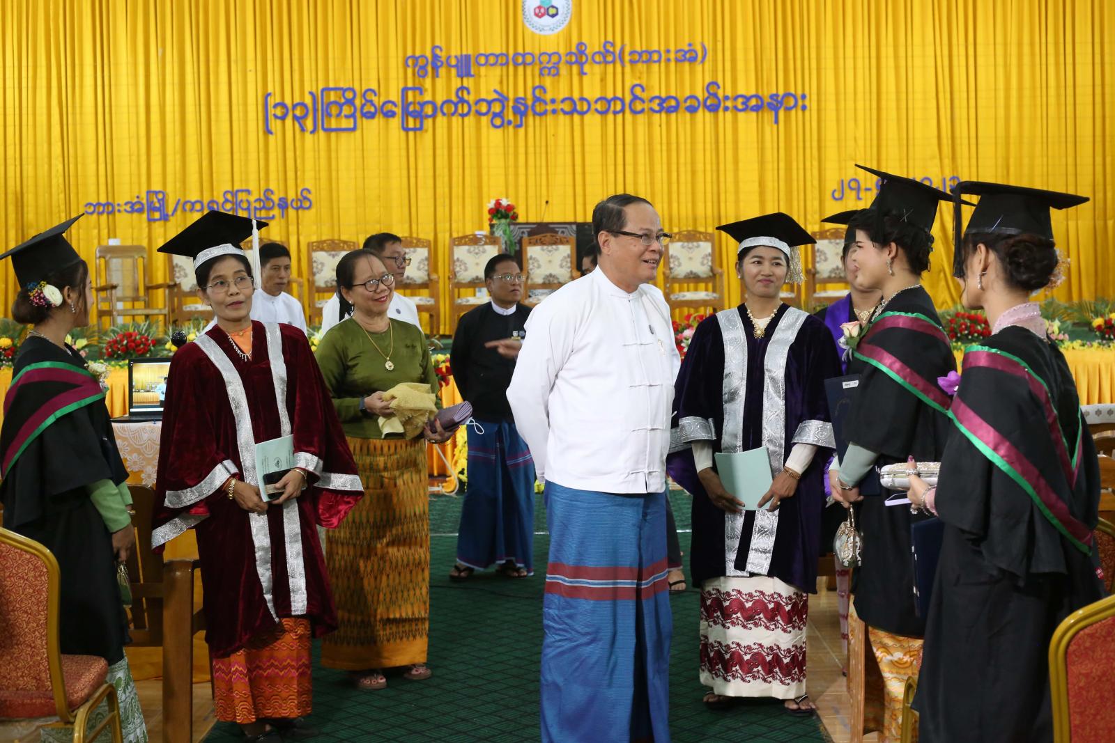 ယနေ့ဘွဲနှင်းသဘင်အခမ်းအနားတွင် အဝေးရောက်ဘွဲ့ယူသူ(၇)ဦးအပါအဝင် စုစုပေါင်း(၂၆)ဦးအား သက်ဆိုင်ရာဘွဲ့အသီးသီးကို အပ်နှင်းခဲ့ပြီး ကရင်ပြည်နယ်ဝန်ကြီးချုပ်ဦးစောမြင့်ဦး၊ ပြည်နယ်တရား လွှတ်တော် တရားသူကြီးချုပ်ဒေါ်ခင်ဆွေထွန်း၊ ပြည်နယ်အစိုးရအဖွဲ့ဝင်များက ဘွဲ့ယူပြီးသူ မောင်မယ်များနှင့်၎င်းတို့၏ မိဘ၊ ဆွေမျိုး၊ ညီအစ်ကိုမောင်နှမများအား ရင်းရင်းနှီးနှီးတွေ့ဆုံ၍ အားပေးစကားများပြောကြားခဲ့ကြောင်း သိရသည်။