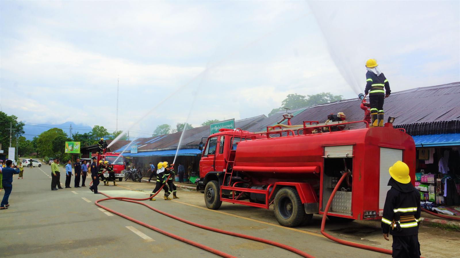 ထို့နောက် မီးသတ်ဦးစီးဌာန မီးသတ်တပ်ဖွဲ့ဝင်အင်အား (၁၄)ဦးတို့က မီးငြှိမ်းသတ်ယာဉ်တစ်စီး၊ မီးသတ်ရေသယ်ယာဉ်တစ်စီး တို့ဖြင့် လက်တွေ့မီးငြှိမ်းသတ် ဇာတ်တိုက်လေ့ကျင့်နေမှုများကို ခရိုင်စီမံအုပ်ချုပ်ရေးအဖွဲ့ဥက္ကဋ္ဌ ဦးခေါင်လန်ဒီး၊ မြို့နယ်စီမံ အုပ်ချုပ်ရေးအဖွဲ့ဥက္ကဋ္ဌ ဦးကျော်ကျော်လွင်၊ ခရိုင်မီးသတ်ဦးစီးဌာန ခရိုင်ဦးစီးမှူး ဦးသိန်းထိုက်၊ မြို့နယ်စည်ပင်သာယာရေးအဖွဲ့ အမှုဆောင်အရာရှိ ဦးတင်ကိုလွင်၊ မြို့နယ်မီးသတ်ဦးစီးဌာန မြို့နယ်ဦးစီးမှူး ဦးတိတု၊ ခရိုင်/ မြို့နယ်ဌာနဆိုင်ရာများနှင့် ဈေးသူ ဈေးသားများက ကြည့်ရှုအားပေးခဲ့ကြသည်။