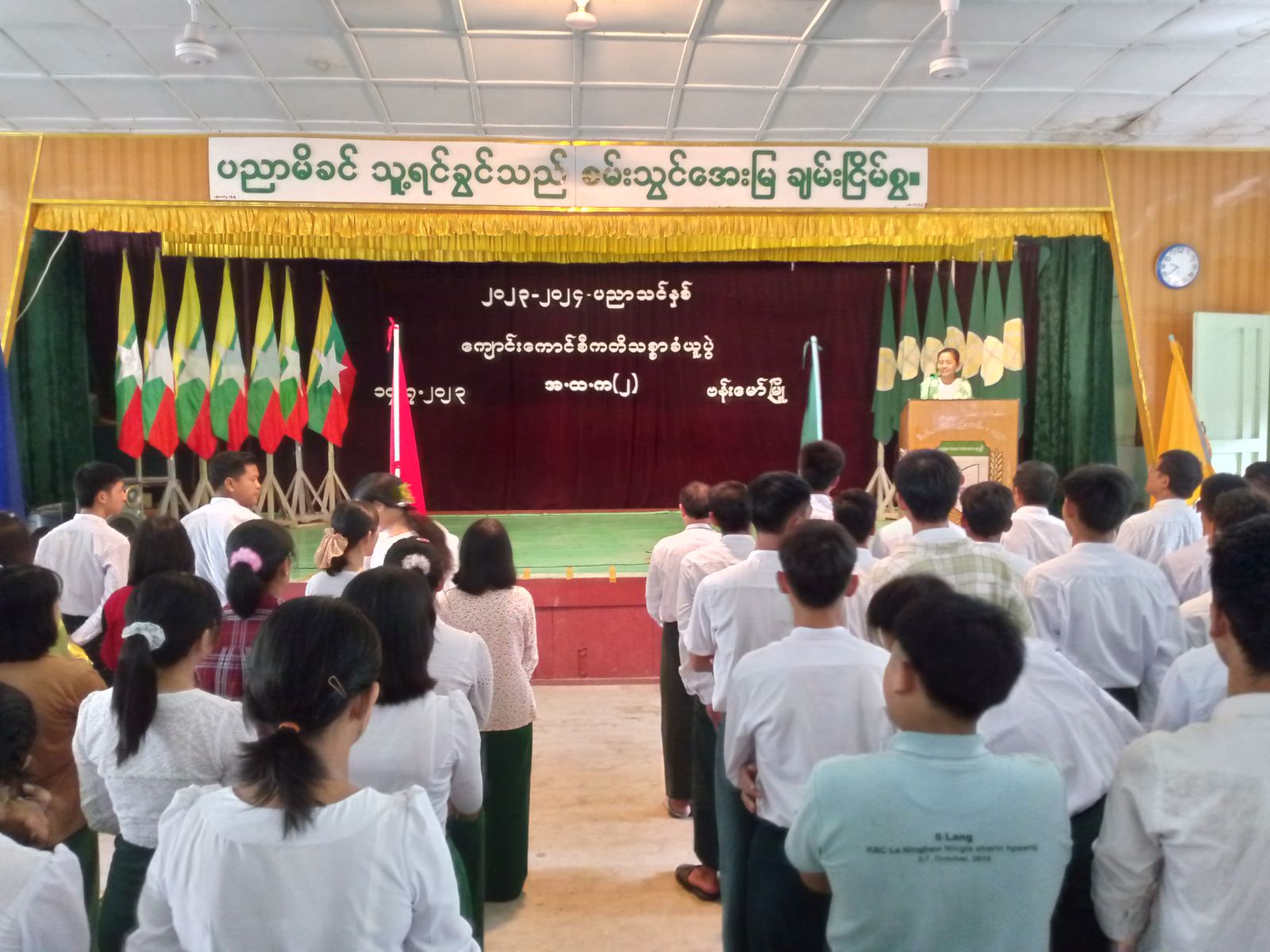 အဆိုအခမ်းအနားကို ကျောင်းကောင်စီသီချင်းဖြင့် ကျောင်းသား၊ကျောင်းသူများက သံပြိုင် သီဆို၍ ဖွင့်လှစ်ခဲ့ပြီး ကျောင်းအုပ်ဆရာမကြီးဒေါ်ခိုင်စန္ဒာက အမှာစကားပြောကြားခြင်း၊ ကျောင်းကောင်စီ အမှုဆောင်အဖွဲ့အမည်စာရင်းဖတ်ကြားခြင်း၊ ကျောင်းကောင်စီအမှုဆောင်အဖွဲ့ကတိသစ္စာ ခံယူခြင်းနှင့် ကျောင်းတစ်ကျောင်းလုံး ကတိသစ္စာခံယူခြင်း၊ တာဝန်အထိမ်းအမှတ်အလံများကို ကျောင်းအုပ်ဆရာမကြီးက ပေးအပ်ရာ ကျောင်းကောင်စီအသင်း (၅)သင်းဖြစ်သည့် အနော်ရထာအသင်း၊ ကျန်စစ်သားအသင်း၊ ဘုရင့်နောင်အသင်း၊ အလောင်းဘုရားအသင်း၊ ဗန္ဓုလအသင်း ခေါင်းဆောင်တို့က လက်ခံခဲ့ကြပြီး ကျောင်းသားကျောင်းသူများက နိုင်ငံတော်သီချင်းကို စုပေါင်း သံပြိုင်သီဆို၍ အခမ်းအနားကို ရုပ်သိမ်းလိုက်ကြောင်းသိရသည်။