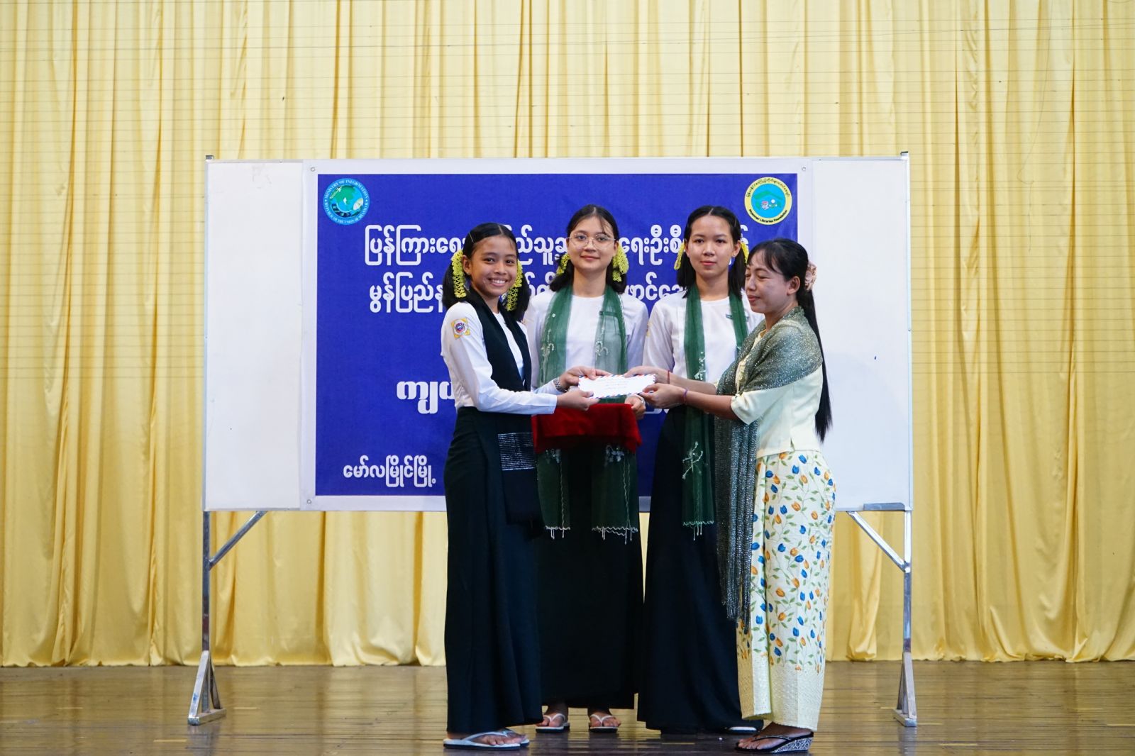 ယင်းနောက် မွန်ပြည်နယ်စာကြည့်တိုက်ဖောင်ဒေးရှင်းမှ တာဝန်ရှိသူများက ကျောင်းစာကြည့်တိုက်အား သုတ၊ ရသစာအုပ်များ ပေးအပ်လှူဒါန်းခဲ့ပြီး ဆုပေးပွဲကို ဆက်လက်ကျင်းပရာ ပြိုင်ပွဲတွင် အလယ်တန်းအဆင့် ပထမ၊ ဒုတိယ၊ တတိယနှင့် အထူးဆုရရှိသူများအား မော်လမြိုင်ခရိုင်ပြန်ကြားရေးနှင့်ပြည်သူ့ဆက်ဆံရေးဦးစီးဌာန လက်ထောက်ညွှန်ကြားရေးမှူး ဒေါ်မြင့်မြတ်သီတာကလည်းကောင်း၊ အထက်တန်းအဆင့် ပထမ၊ ဒုတိယ၊ တတိယနှင့် အထူးဆုရရှိသူများအား မွန်ပြည်နယ်စာကြည့်တိုက်ဖောင်ဒေးရှင်းဥက္ကဋ္ဌ ဦးချိုချိုကလည်းကောင်း ဆုများအသီးသီး ချီးမြှင့်ခဲ့ပြီး ကျောင်းအကျိုးတော်ဆောင် ဦးလွင်မိုးက ပြိုင်ပွဲ၀င်ရောက်ကြသည့် ကျောင်းသူလေးများအား ဂုဏ်ပြုငွေများပေးအပ်ကာ ပြိုင်ပွဲဝင်ကျောင်းသူလေးများနှင့် အမှတ်တရဓာတ်ပုံရိုက်ကူးခဲ့ကြောင်း သိရှိရသည်။